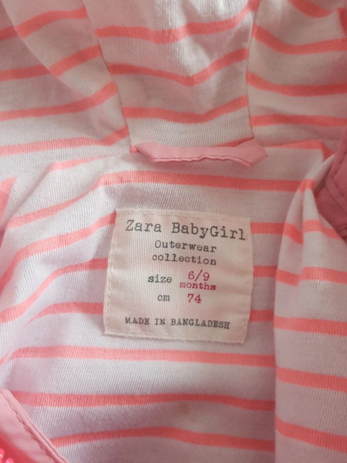 Tous mes articles Zara : #zarasev Toutes mes vestes : #vestesev Tous mes habits ♀️ 6 mois : #6moissevfille Tous mes habits ♀️ 9 mois : #9moissevfille 🚨 Prix fixe Veste / imperméable / coupe vent avec capuche Marque : ZARA Couleur : rose Taille : 6 à 9 mois - 74 cm État : très bon état Élastique à la taille + aux poignets 100% polyester Doublure : 74% polyester ; 26% coton Doublure manches : 100% polyester Retrait sur place ou envoi.