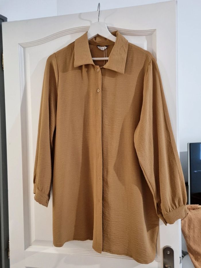 Chemisier longue peut se porter en chemise ou robe . Peut se porter avec une ceinture pour ceintrer la robe . VENDU SANS LA CEINTURE. Taille L/XL jamais porter