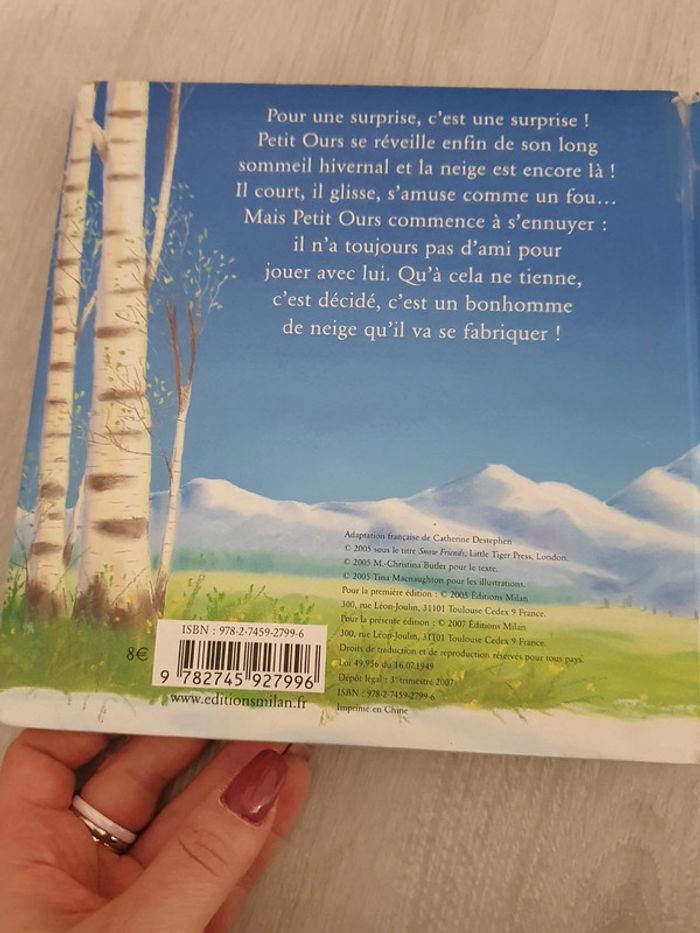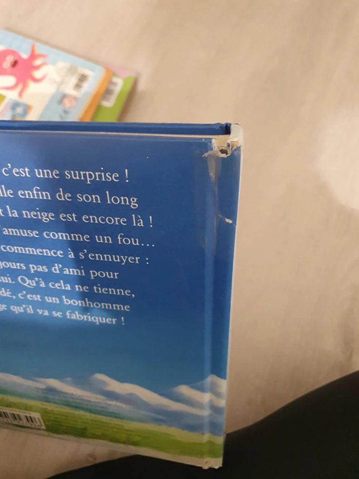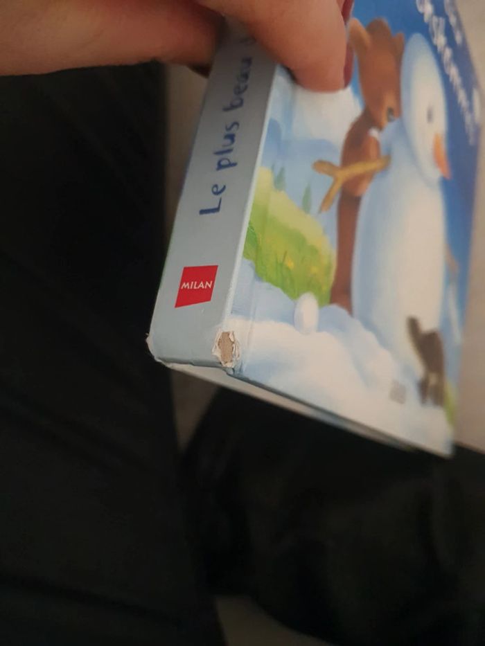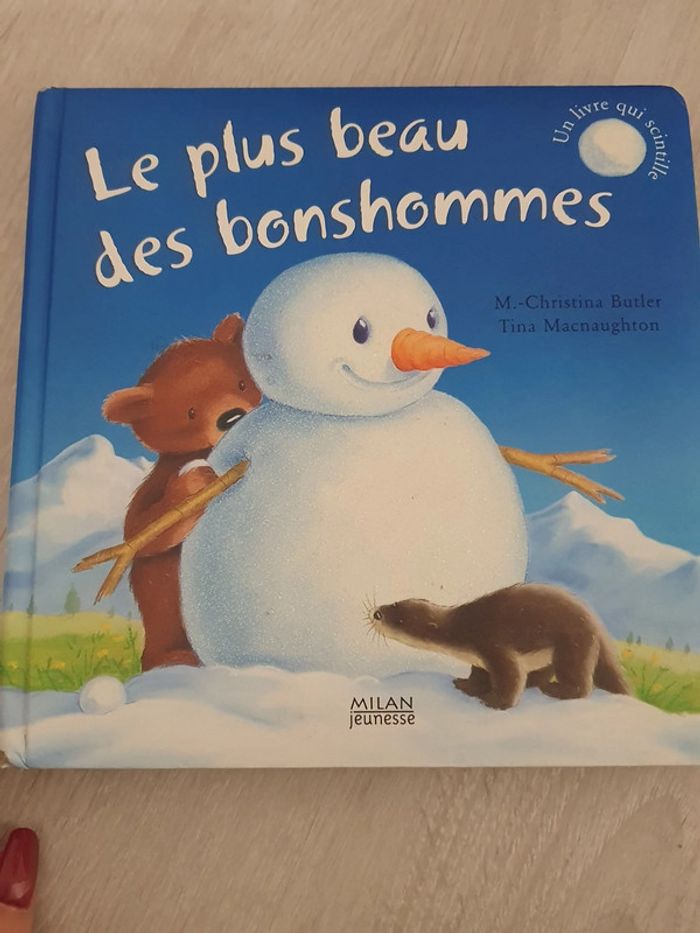 Livre bonhomme de neige qui scintille à l interieur satisfisanr juste les petit coin du livre abimer rien de méchant.