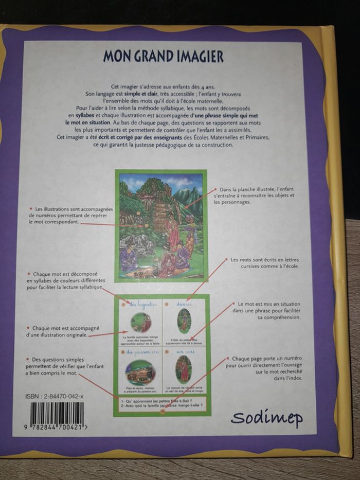 livre Mon grand imagier Les pays du monde écrit par des enseignants dernière page abîmée #livreenfantscoubi62 #scolairescoubi62 Cet imagier s'adresse aux enfants dès 4 ans. Son langage est simple et clair, très accessible l'enfant y trouvera l'ensemble des mots qu'il doit connaître à l'école maternelle. Pour l'aider à lire selon la méthode syllabique, les mots sont décomposés en syllabes et chaque illustration est accompagnée d'une phrase simple qui met le mot en situation. Au bas de chaque page, des questions se rapportent aux mots les plus importants et permettent de contrôler que l'enfant les a assimilés.