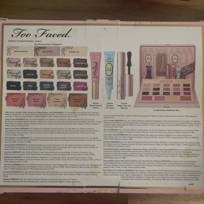 Le coffret contient : - 18 ombres à paupières - une poudre de soleil - deux blushes - un illuminateur - un mascara Better Than Sex - une base yeux Shadow Insurance - le rouge à lèvres Melted Pe