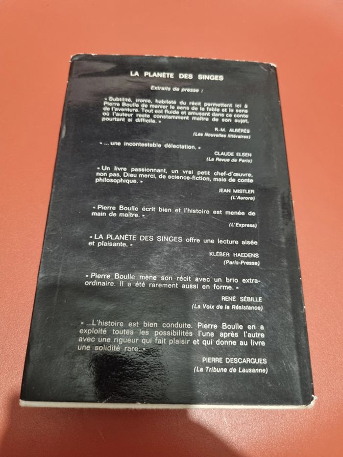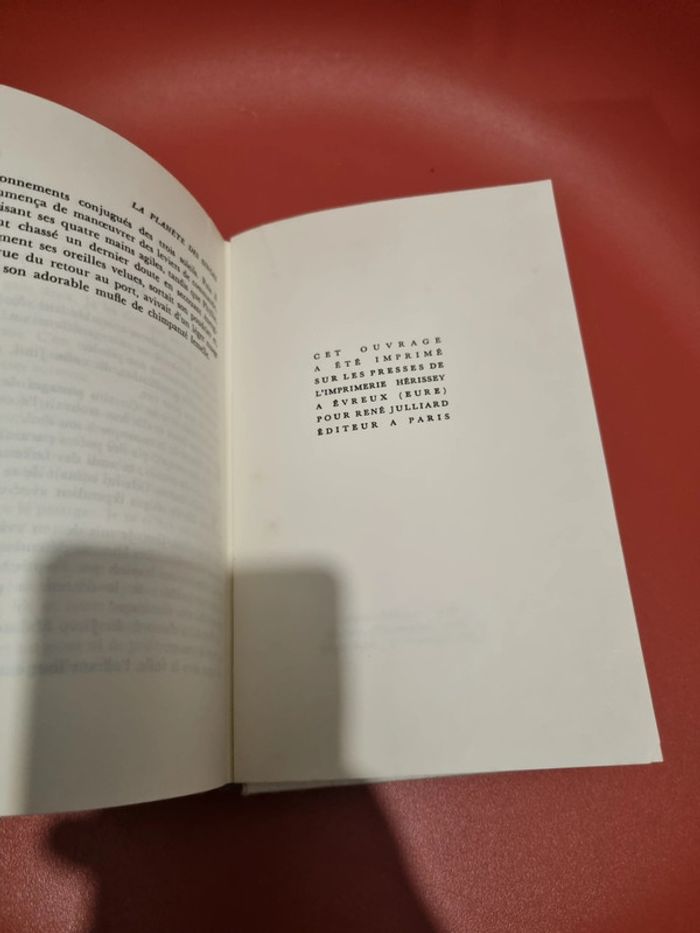 livre de Pierre Boulle la planète des singes édition Julliard 1967 la pochette est abimée - la tranche a des taches pas d'odeur -- le livre présente bien sans la pochette édition peu courante..; voir les photos pour apprécier l'état