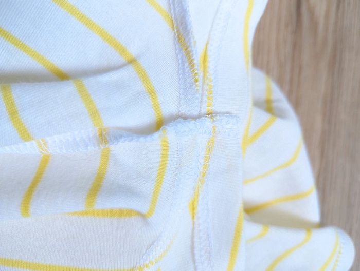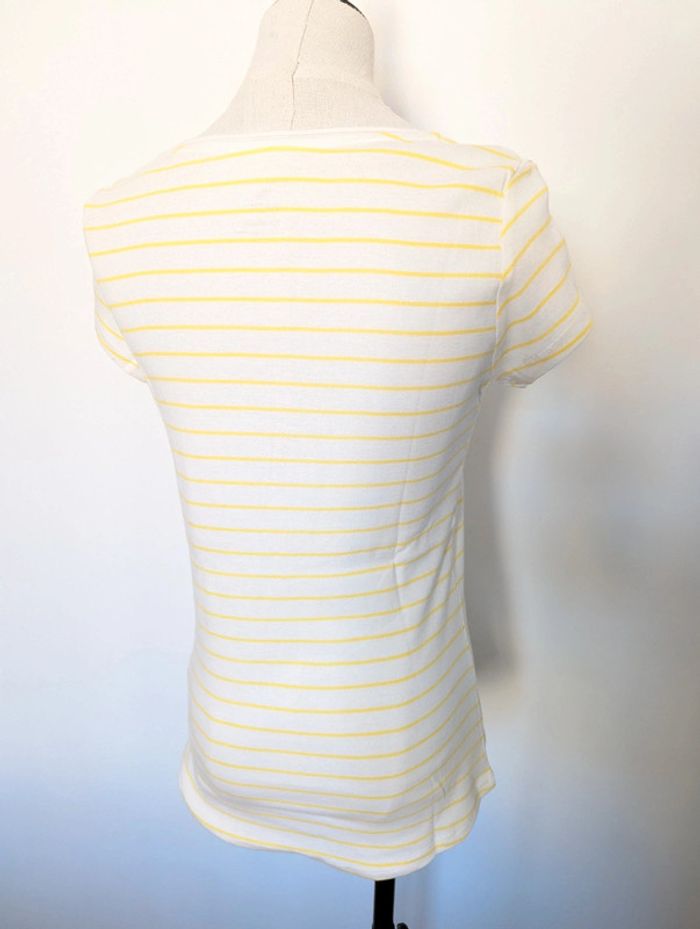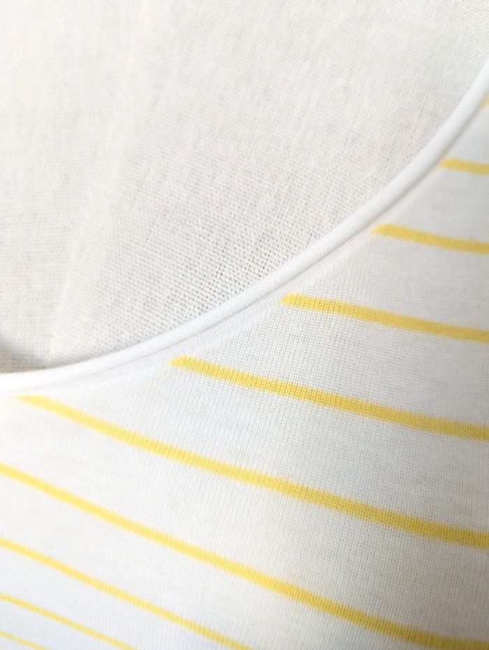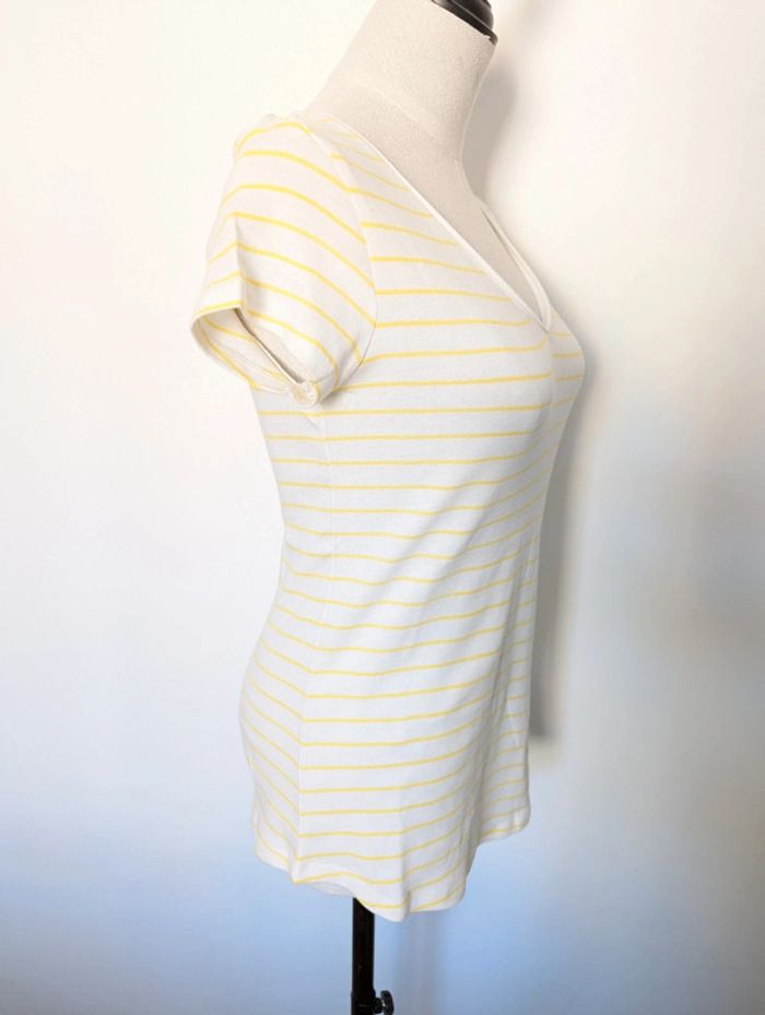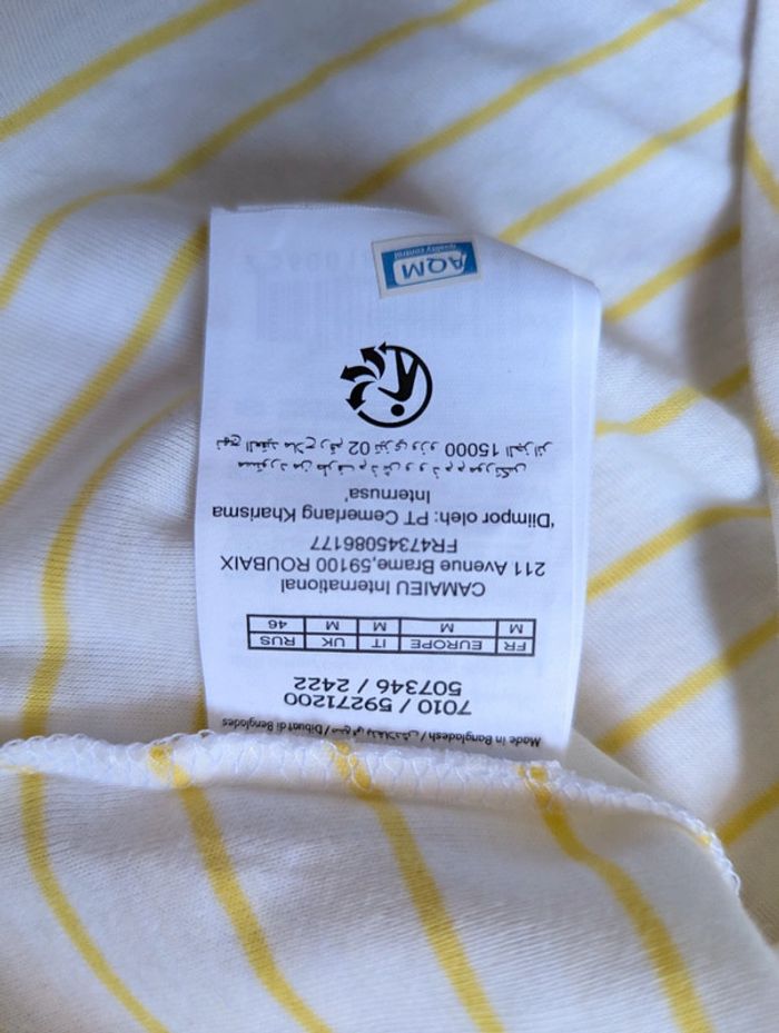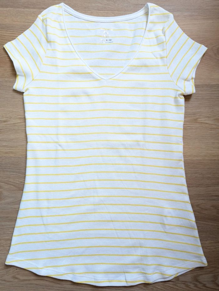 T-shirt manches courtes Camaïeu Rayé blanc et jaune Neuf sans étiquette jamais porté Col V légèrement roulotté Taille M Bas arrondi #38 #38mavelda