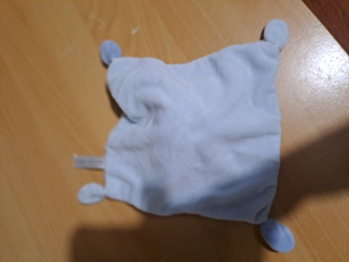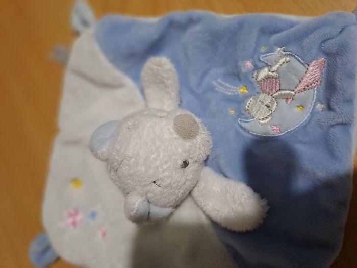 Doudou ourson bleu et blanc. Neuf, car mon fils ne s'y est jamais intéressé.