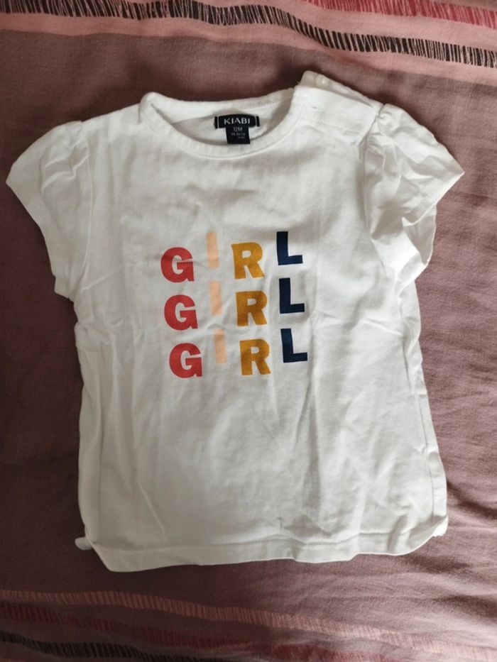 T shirt manche courte fille 12 mois 73/76 cm kiabi blanc avec écrit girl en plusieurs couleurs. État nickel porté une fois où deux max Pas de tâches pas de trous #12moisfille #9moisfille