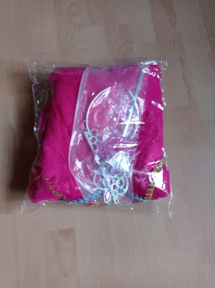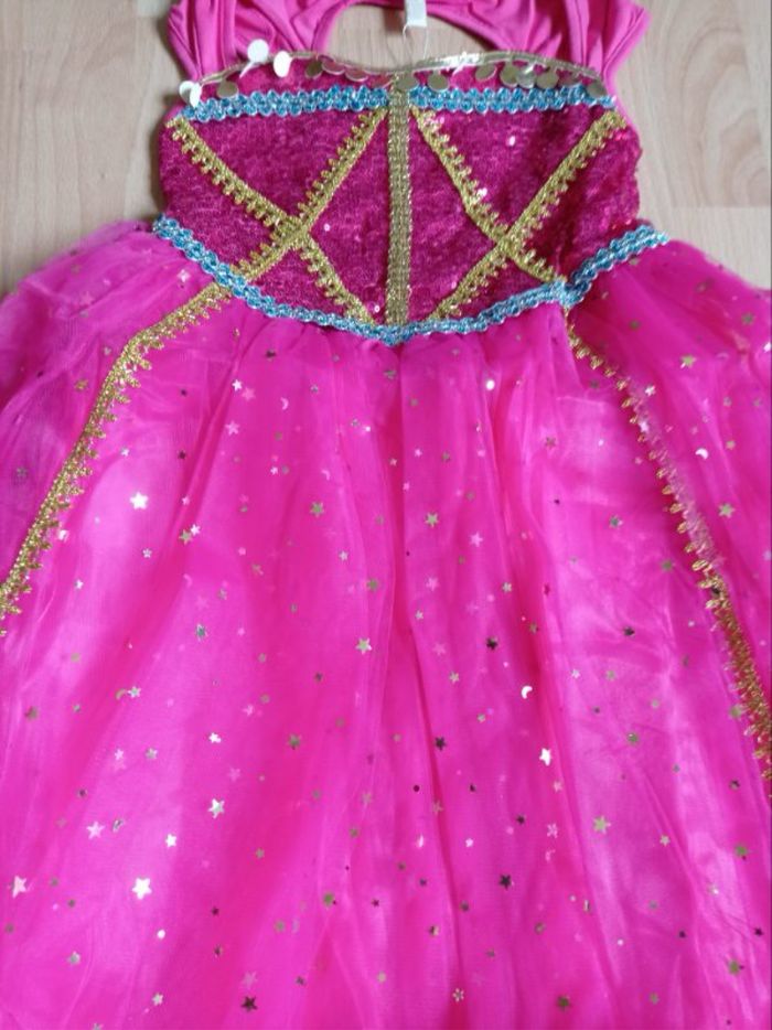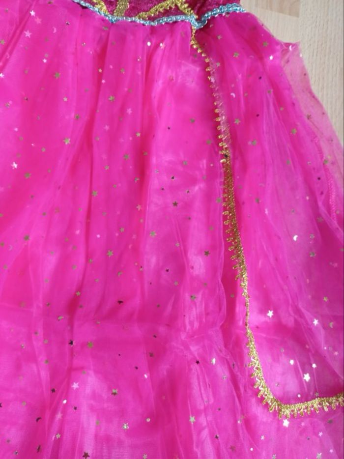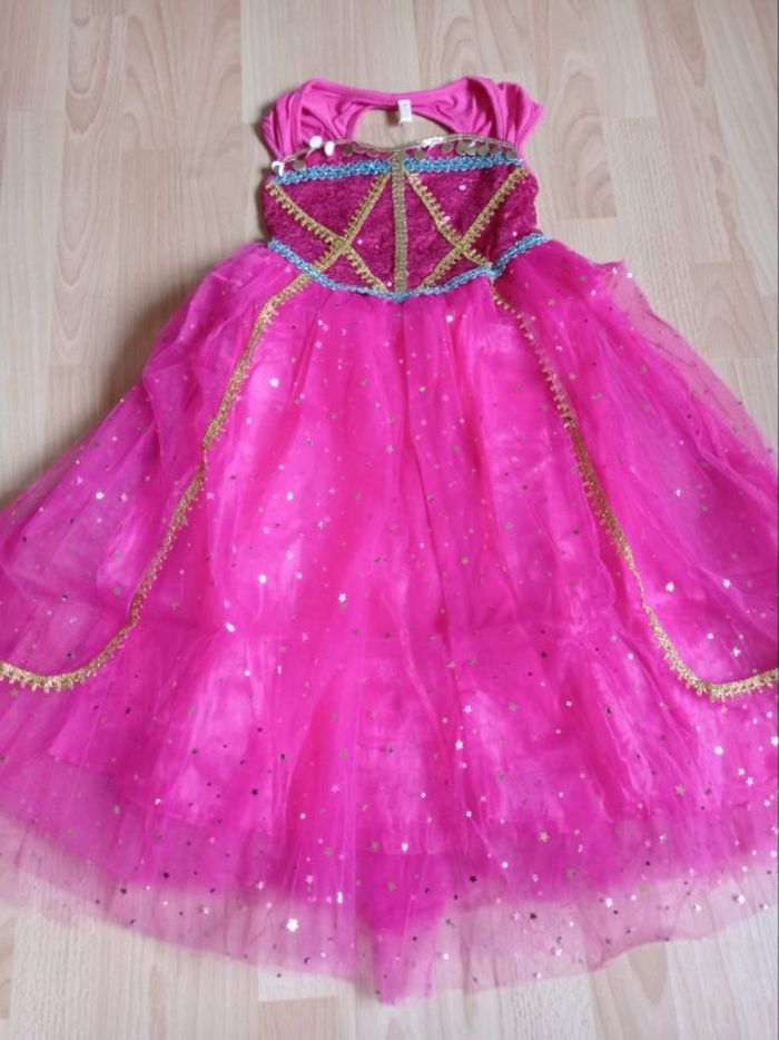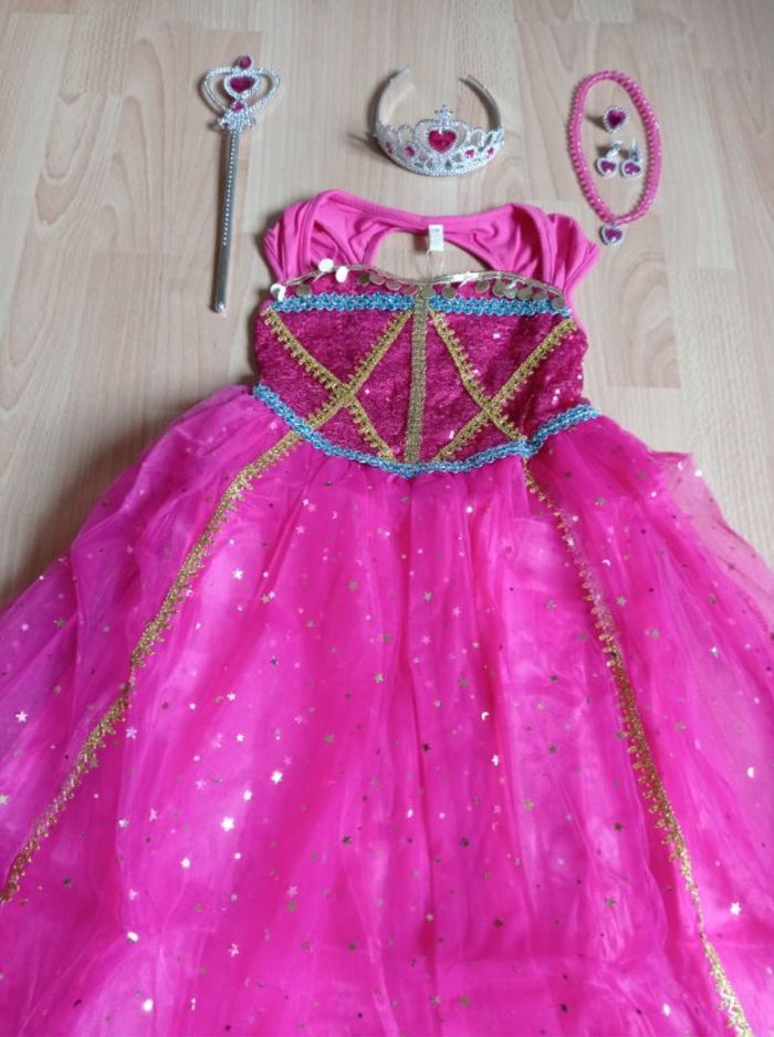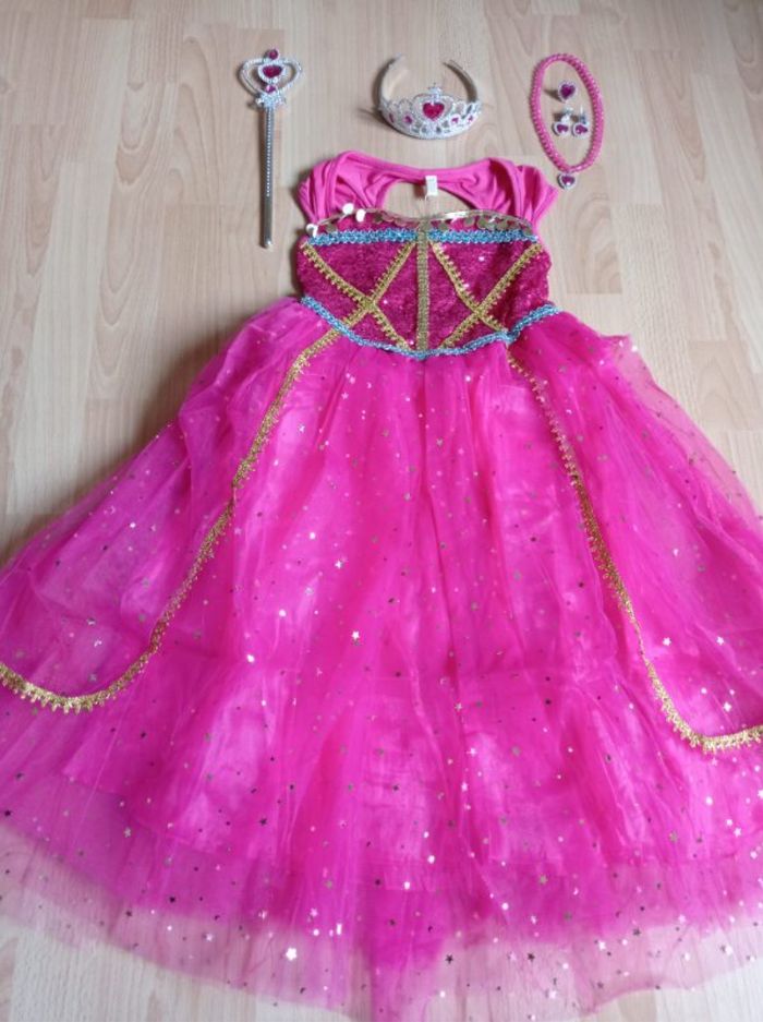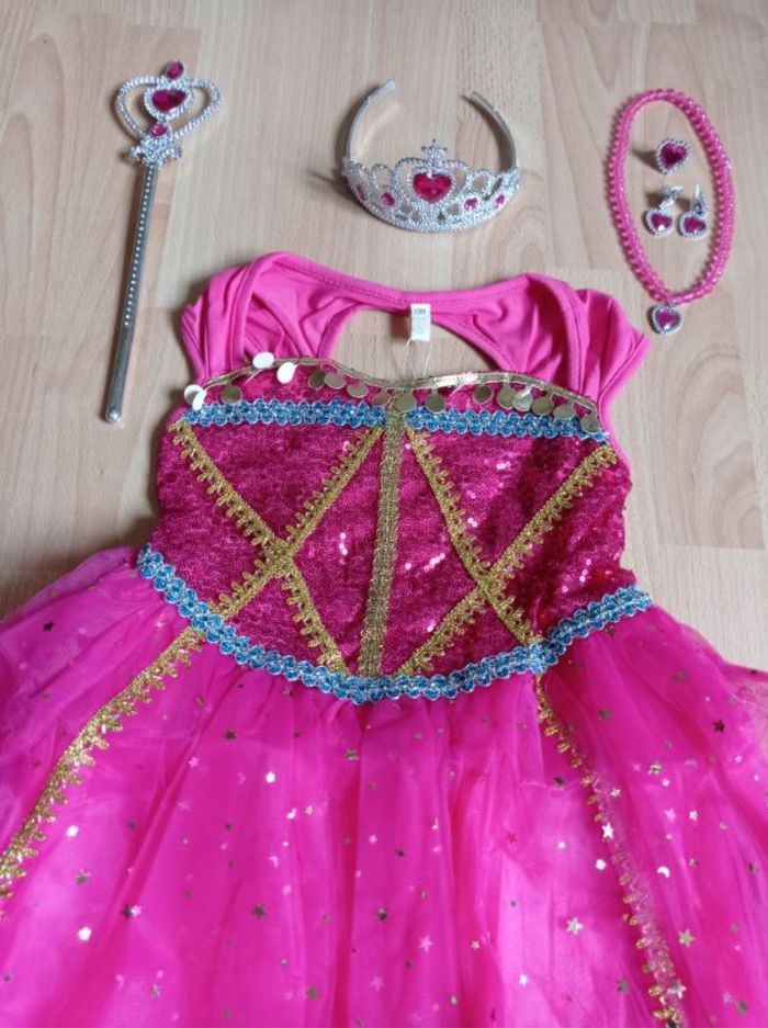 Déguisement robe princesse Jasmine rose et ces accessoires (baguette, couronne, bijoux). La robe mesure 85cm de longueur, la taille convient aux petites filles de 5-6ans. Totalement neuve, vendue dans son emballage d’origine. Expédition rapide après votre commande