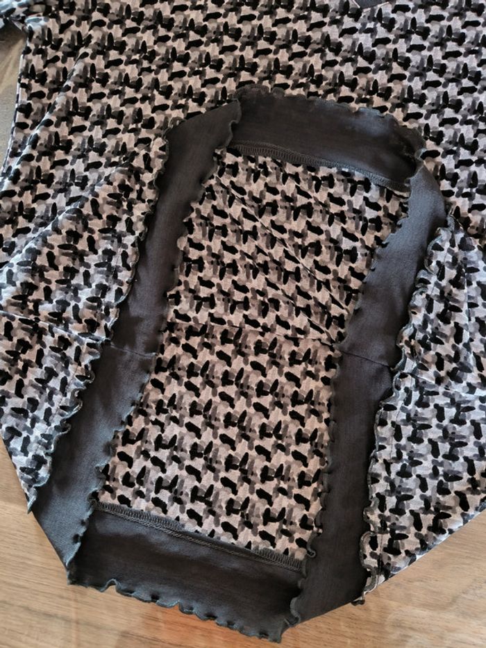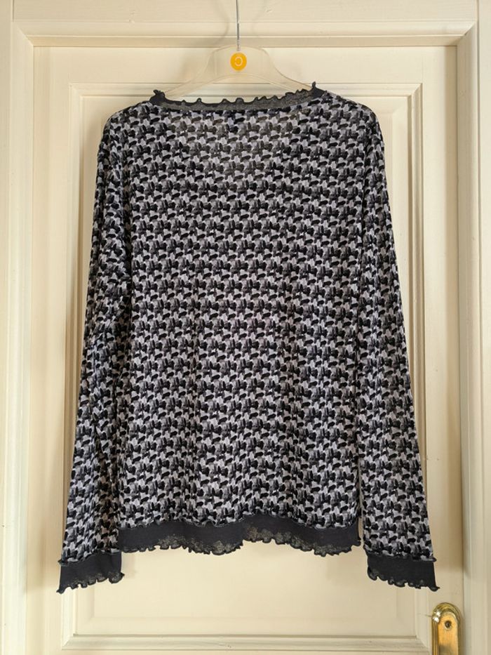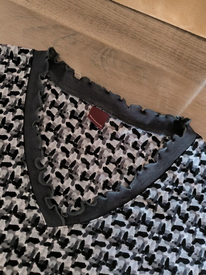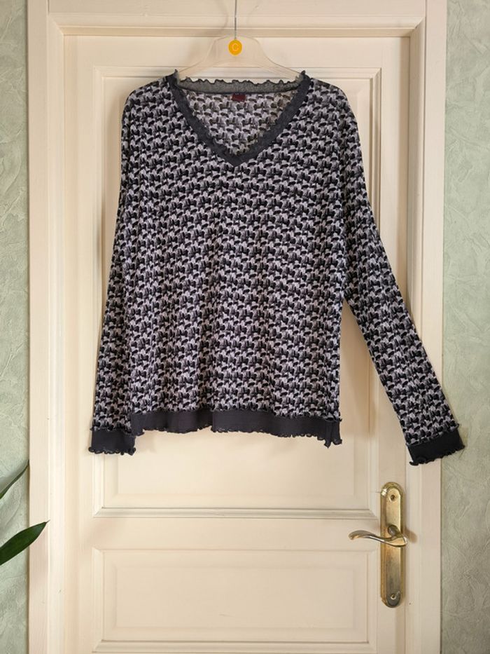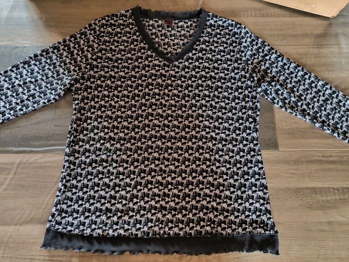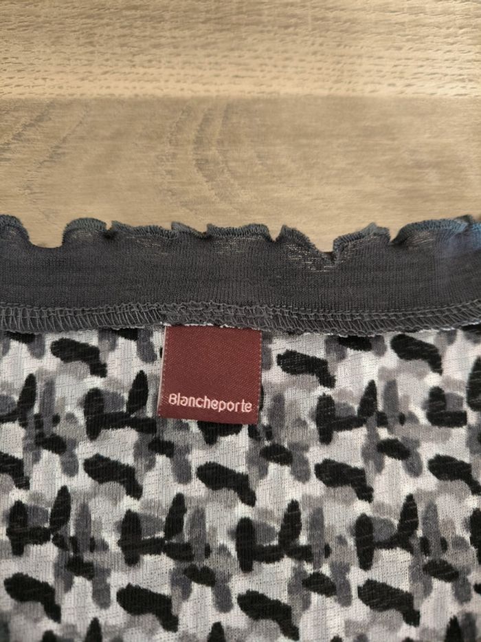 ⚠️ Description complète → Plus ⚠️ Blouse/T-shirt à manches longues Marque Blancheporte Taille 46-48 • Coloris gris, noir • Imprimés • Col, bas des manches et du bas volanté • Tissu fin, stretch Largeur épaule à épaule non étirée : 45 cm Largeur épaule à épaule étirée au maximum : 70 cm Largeur aisselle à aisselle non étirée : 55 cm Largeur aisselle à aisselle étirée au maximum : 102 cm Longueur manche : 64 cm Longueur totale : 68 cm Longueur aisselle : 43 cm En très bon état #evelyne_taille_46 #evelyne_taille_48