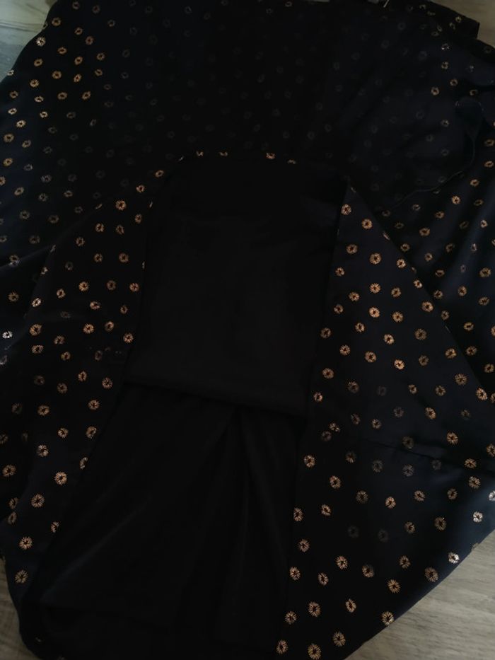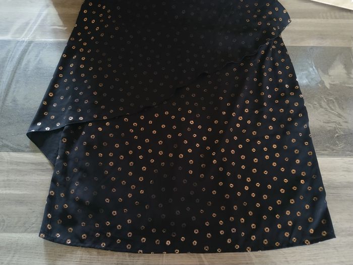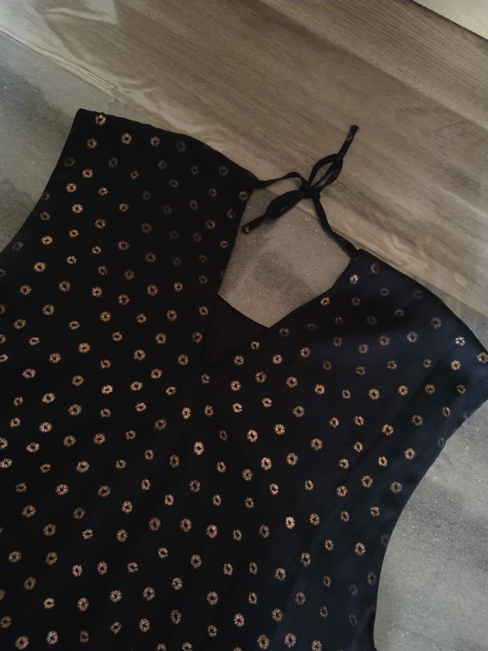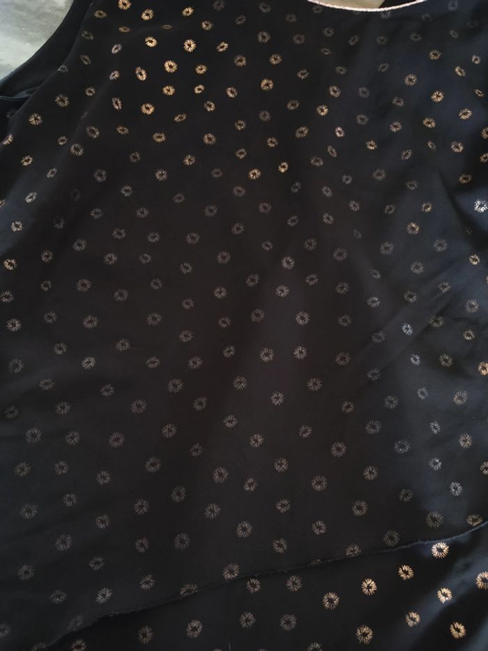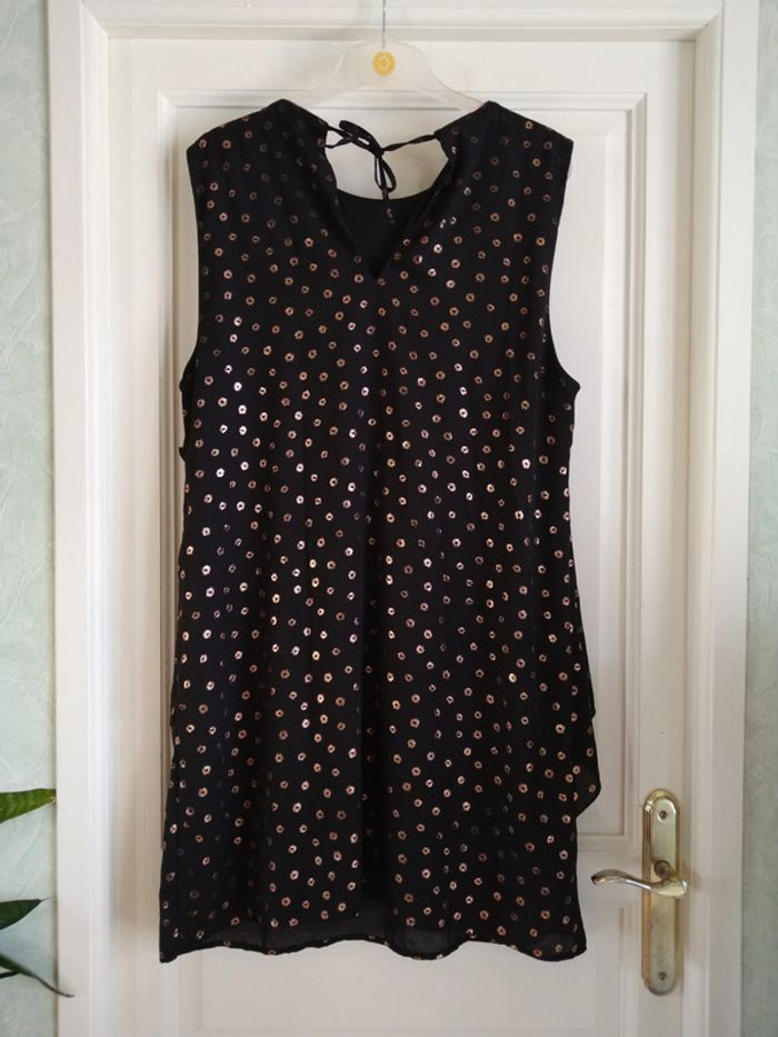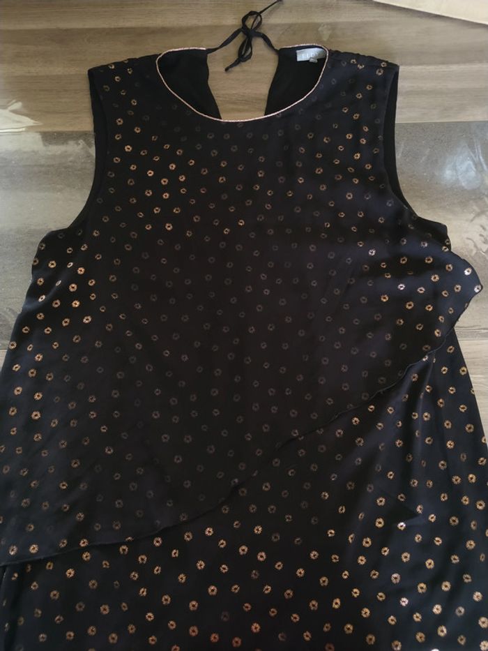 ⚠️ Description complète → Plus ⚠️ Robe fête/soirée sans manches Marque Eldys Taille 46 • Coloris noir • Motif brillants cuivrés • Dos à nouer • Volants • Doublure • Voile abîmé au niveau de la couture • Motifs brillants effacés à certains endroits Largeur aisselle à aisselle non étirée : 54 cm Largeur aisselle à aisselle étirée au maximum : 58 cm Longueur totale : 96 cm Longueur aisselle : 65 cm En état satisfaisant #evelyne_taille_46