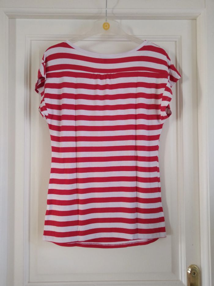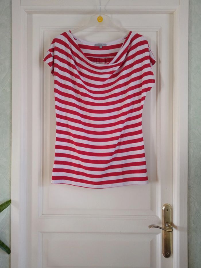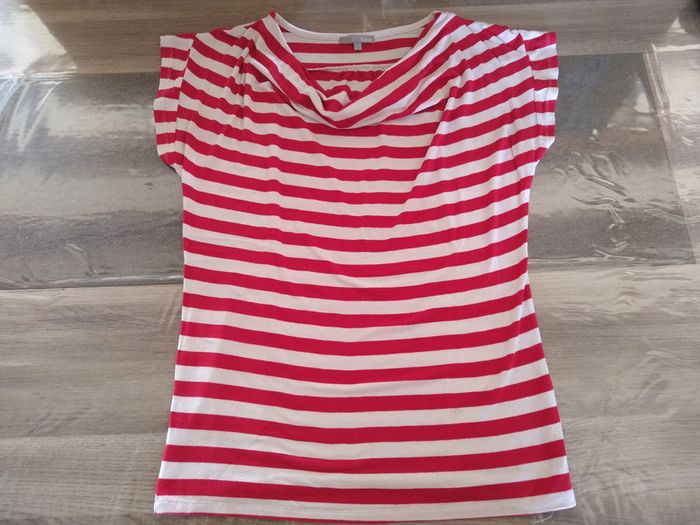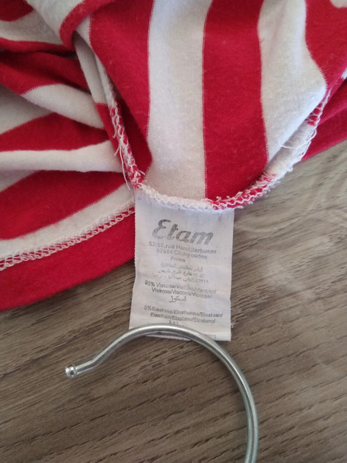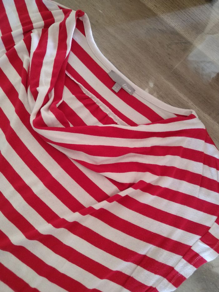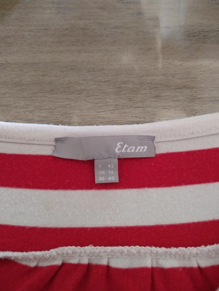 ⚠️ Description complète → Plus ⚠️ T-shirt à manches courtes Marque Etam Taille 42 • Coloris rouge, blanc • Rayures horizontales • Col tombant • Bouloché • Petites taches Largeur épaule à épaule non étirée : 48 cm Largeur épaule à épaule étirée au maximum : 90 cm Largeur aisselle à aisselle non étirée : 49 cm Largeur aisselle à aisselle étirée au maximum : 94 cm Longueur totale : 65 cm Longueur aisselle : 41 cm En bon état #evelyne_taille_42