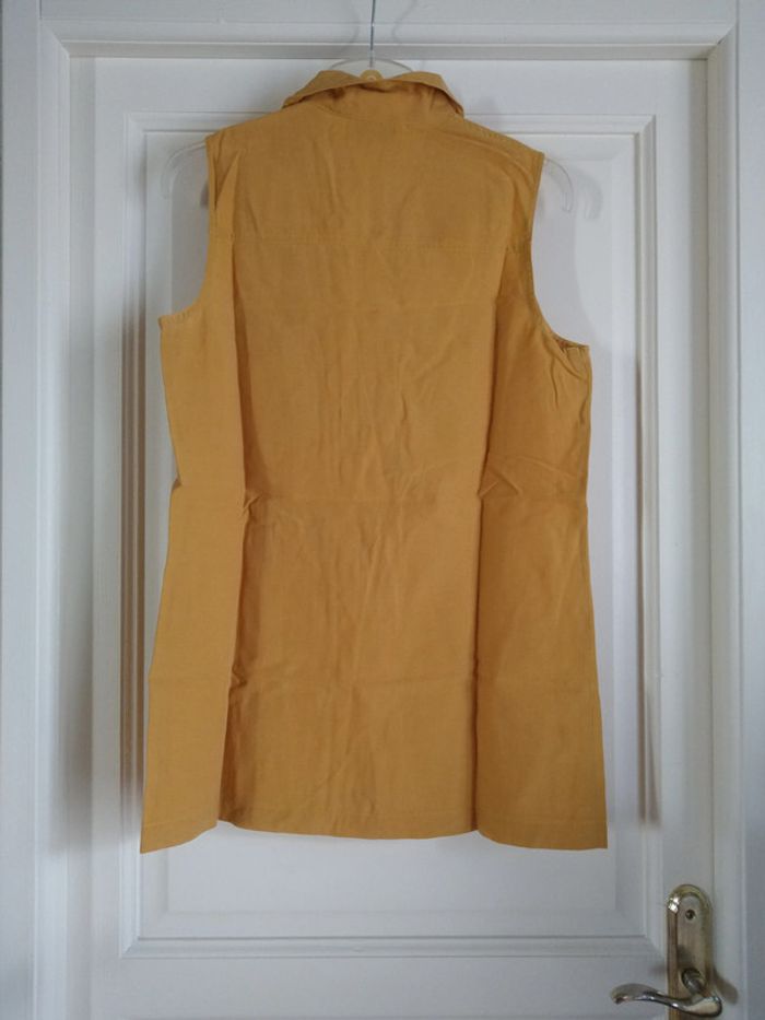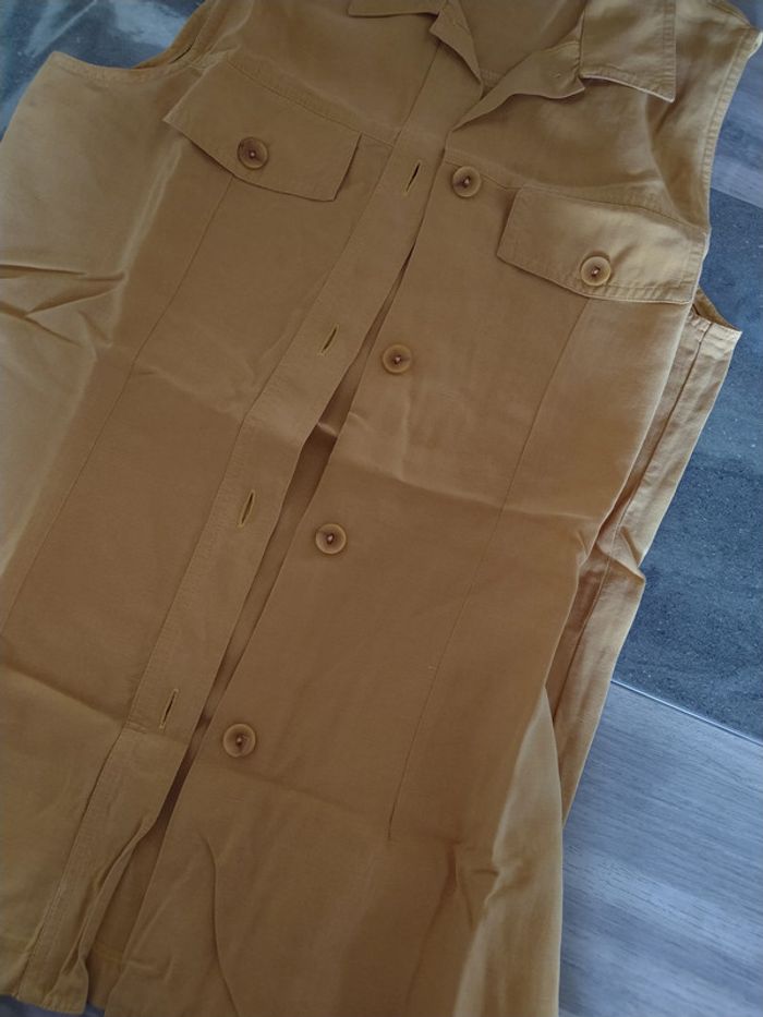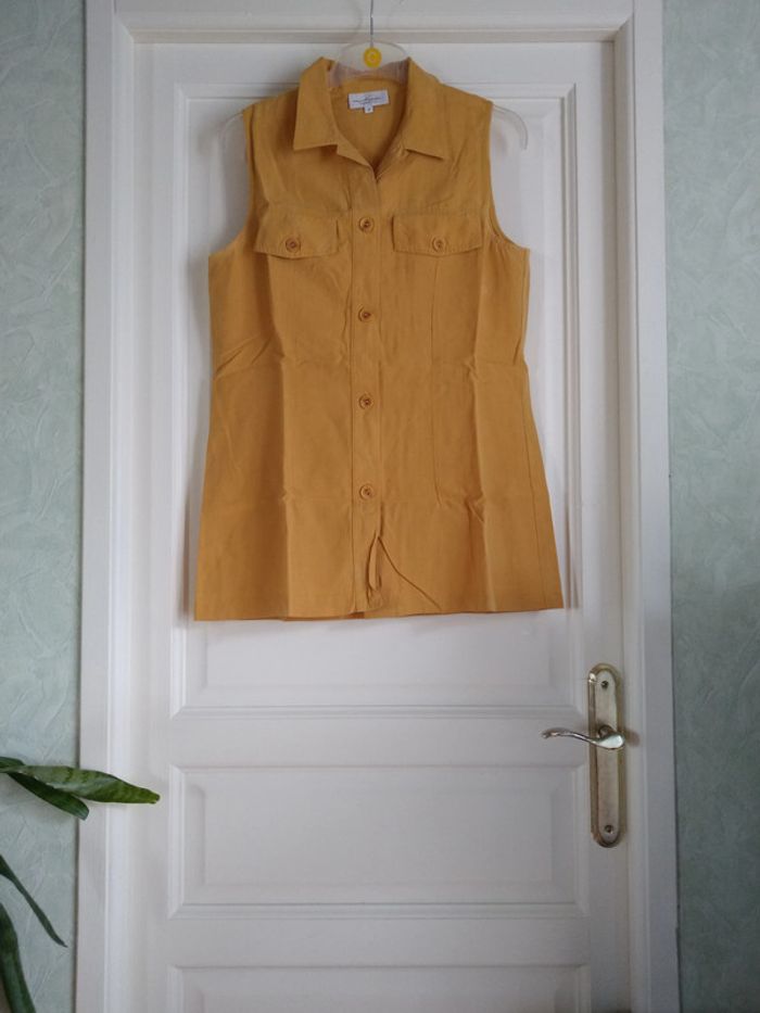 ⚠️ Description complète → Plus ⚠️ Chemise sans manches Marque Camaïeu Taille 2, 38-40 • Coloris moutarde • Fermeture par boutons • 2 fausses poches Largeur aisselle à aisselle non étirée : 47 cm Largeur aisselle à aisselle étirée au maximum : 52 cm Longueur totale : 75 cm Longueur aisselle : 50 cm En très bon état #evelyne_taille_38 #evelyne_taille_40