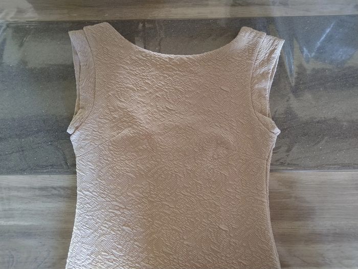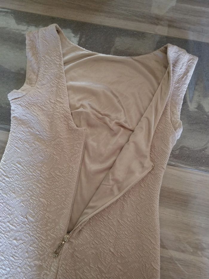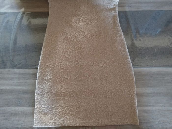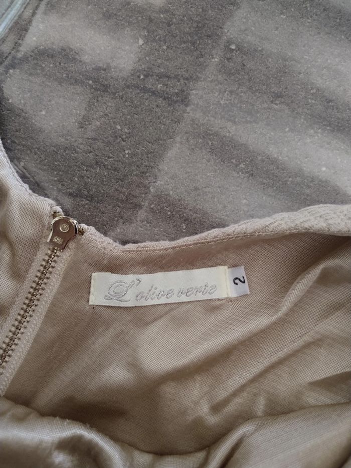 ⚠️ Description complète → Plus ⚠️ Robe sans manches Marque L'olive verte Taille 2, 38-40 • Coloris beige • Motifs en reliefs • Décollé dans le dos • Fermeture éclair au dos • Doublure • Stretch • Quelques accros sur la doublure Largeur aisselle à aisselle non étirée : 40 cm Largeur aisselle à aisselle étirée au maximum : 62 cm Longueur totale : 89 cm Longueur aisselle : 66 cm En très bon état #evelyne_taille_38 #evelyne_taille_40