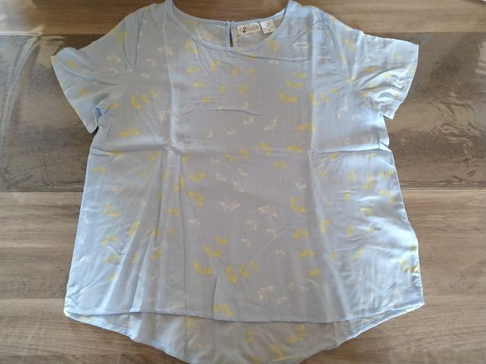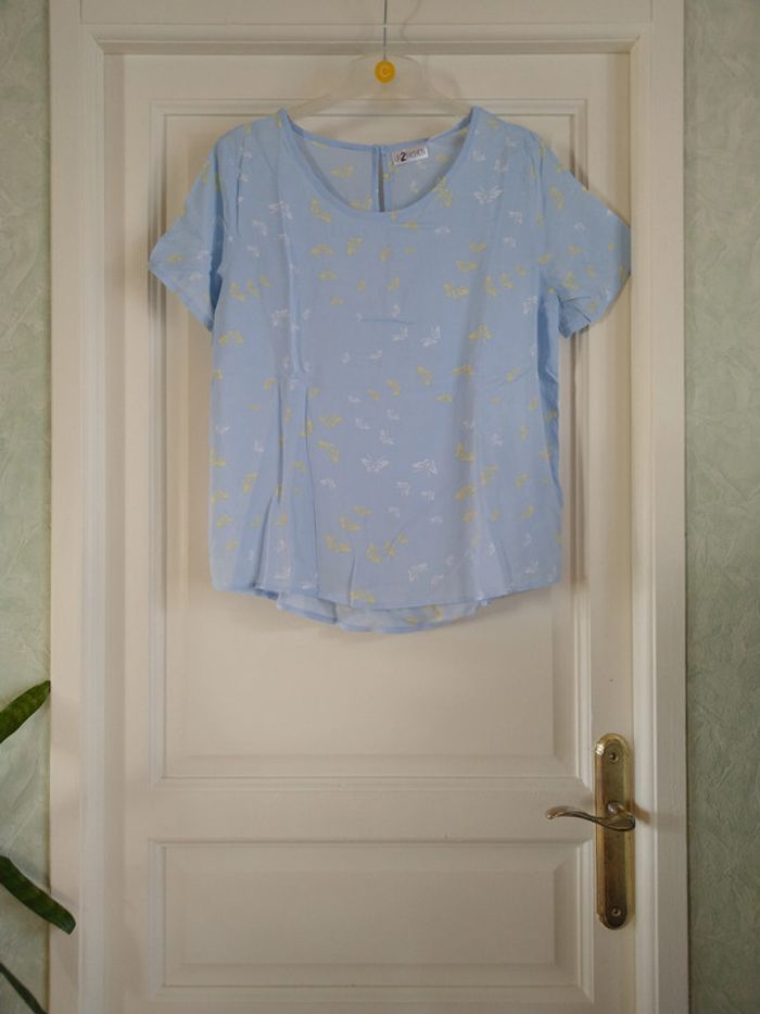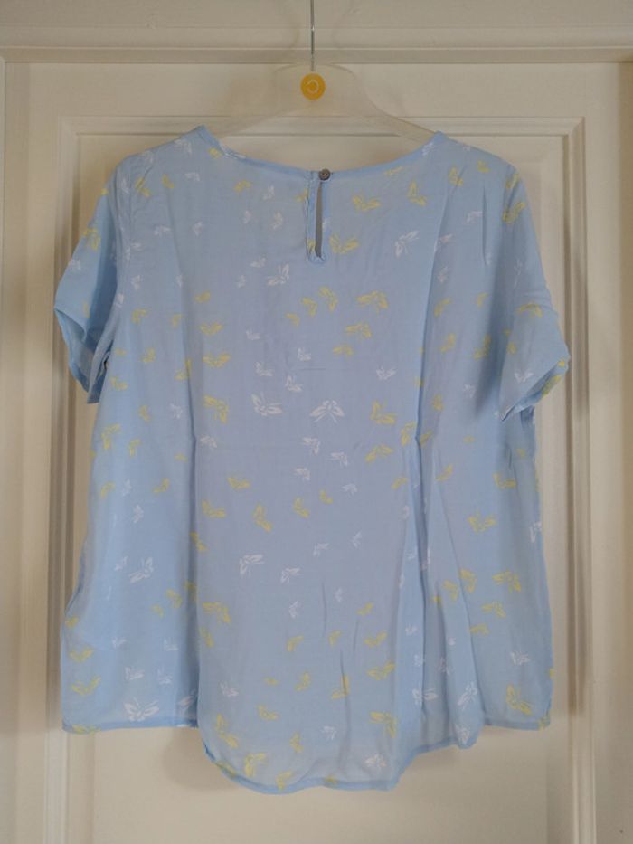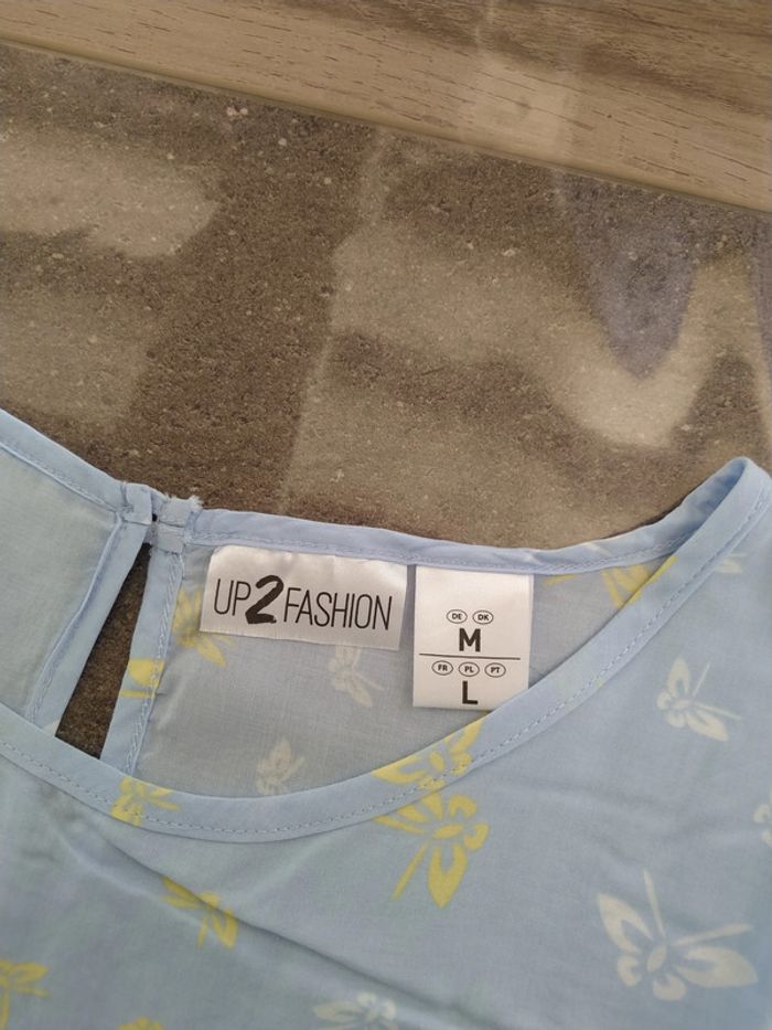⚠️ Description complète → Plus ⚠️ Blouse/T-shirt à manches courtes Marque Up2Fashion Taille L, 40 • Coloris bleu ciel, jaune, blanc • Imprimés papillons • Goutte au dos • Tissu léger, fin Largeur épaule à épaule non étirée : 37 cm Largeur épaule à épaule étirée au maximum : 44 cm Largeur aisselle à aisselle non étirée : 52 cm Largeur aisselle à aisselle étirée au maximum : 57 cm Longueur totale : 60 cm Longueur aisselle : 36 cm Portée une fois, comme neuve #evelyne_taille_40