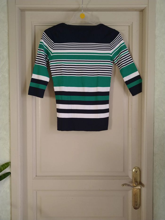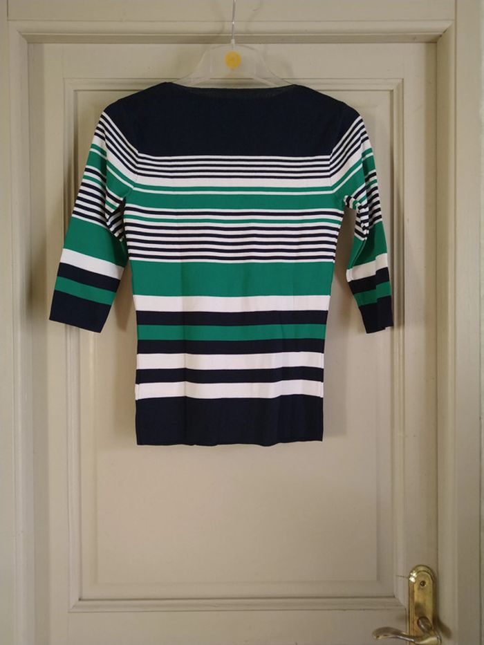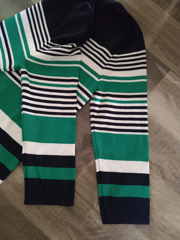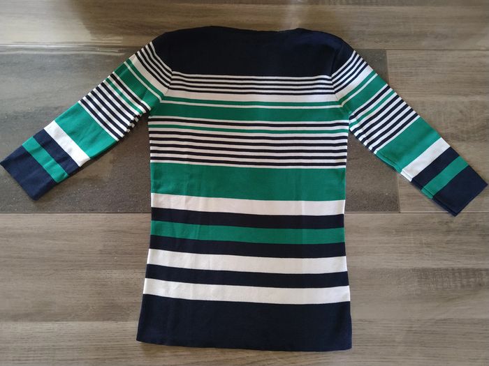 ⚠️ Description complète → Plus ⚠️ Pull à manches 3/4 Marque Damart Taille 38-40 • Coloris marine, vert, blanc • Col bateau • Rayures horizontales • Pull fin • Stretch Largeur épaule à épaule non étirée : 32 cm Largeur épaule à épaule étirée au maximum : 53 cm Largeur aisselle à aisselle non étirée : 37 cm Largeur aisselle à aisselle étirée au maximum : 71 cm Longueur totale : 57 cm Longueur aisselle : 39 cm Porté une fois, comme neuf #evelyne_taille_38 #evelyne_taille_40