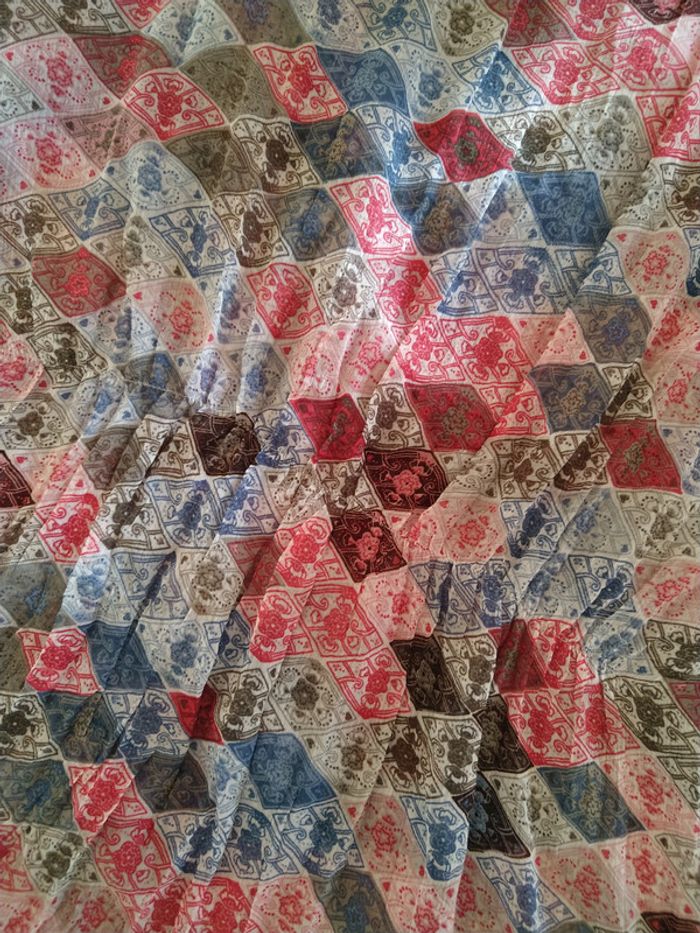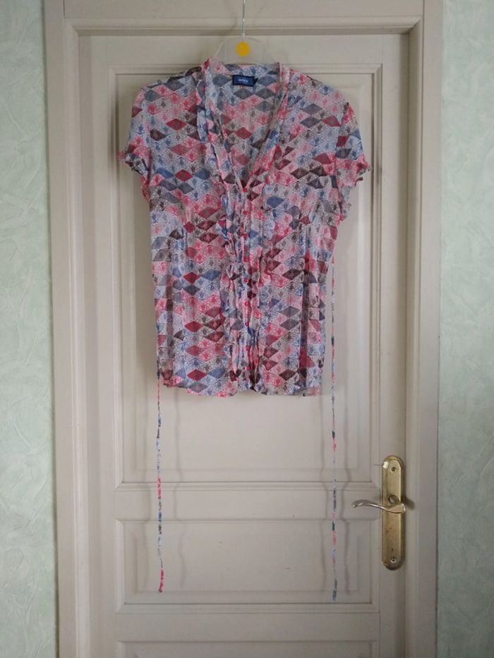 ⚠️ Description complète → Plus ⚠️ Chemise à manches courtes Marque Mexx Taille 42-44 • Coloris rouge, bleu crème, blanc, marron, gris • Imprimés losanges avec fleurs • Fermeture par boutons • Fronces/Volants le long de la boutonnière • Ceinture intégrée • Bandes élastiques à la taille et au dos • Tissu fin • Quelques fils de tirés Largeur épaule à épaule non étirée : 40 cm Largeur épaule à épaule étirée au maximum : 49 cm Largeur aisselle à aisselle non étirée : 46 cm Largeur aisselle à aisselle étirée au maximum : 62 cm Longueur totale : 66 cm Longueur aisselle : 38 cm En très bon état #evelyne_taille_42 #evelyne_taille_44