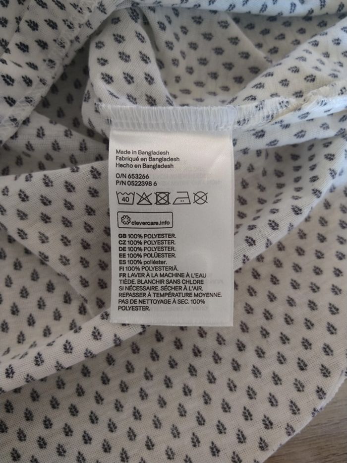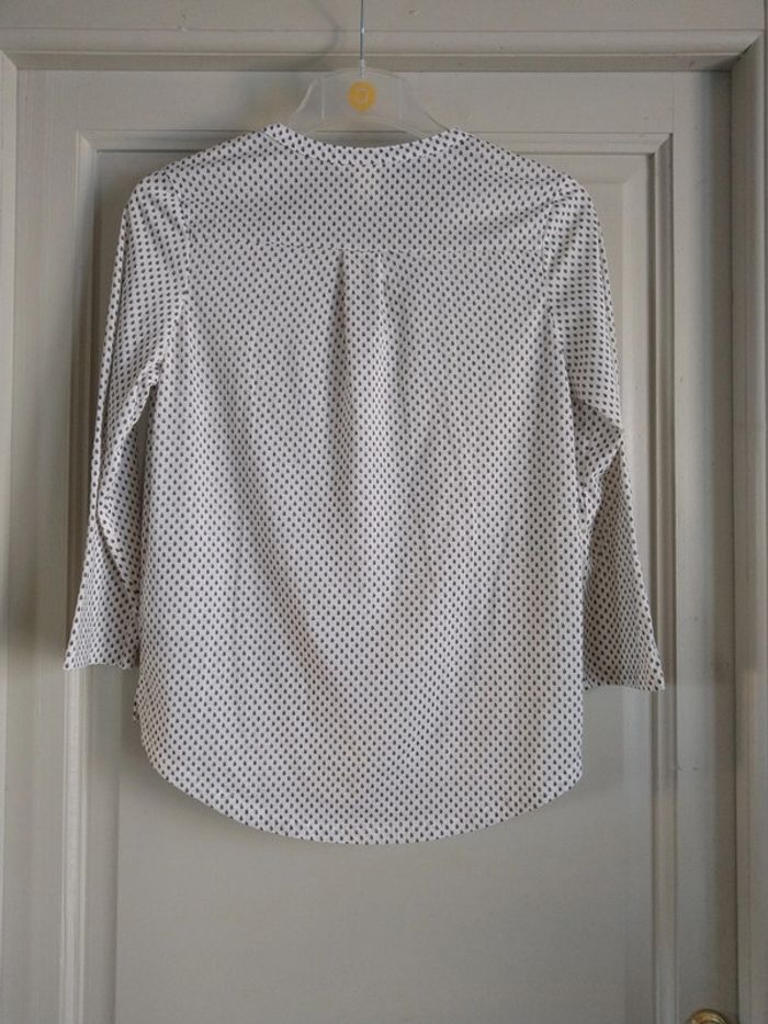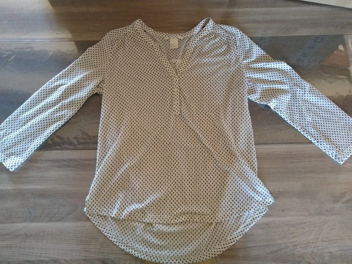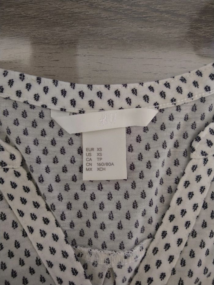 ⚠️ Description complète → Plus ⚠️ Blouse à manches 3/4 Marque H&M Taille XS, 34 • Coloris crème, marine • Imprimés • Boutons au col • Tissu fin Largeur épaule à épaule non étirée : 35 cm Largeur épaule à épaule étirée au maximum : 52 cm Largeur aisselle à aisselle non étirée : 45 cm Largeur aisselle à aisselle étirée au maximum : 62 cm Longueur totale : 59 cm Longueur aisselle : 34 cm En très bon état #evelyne_taille_34