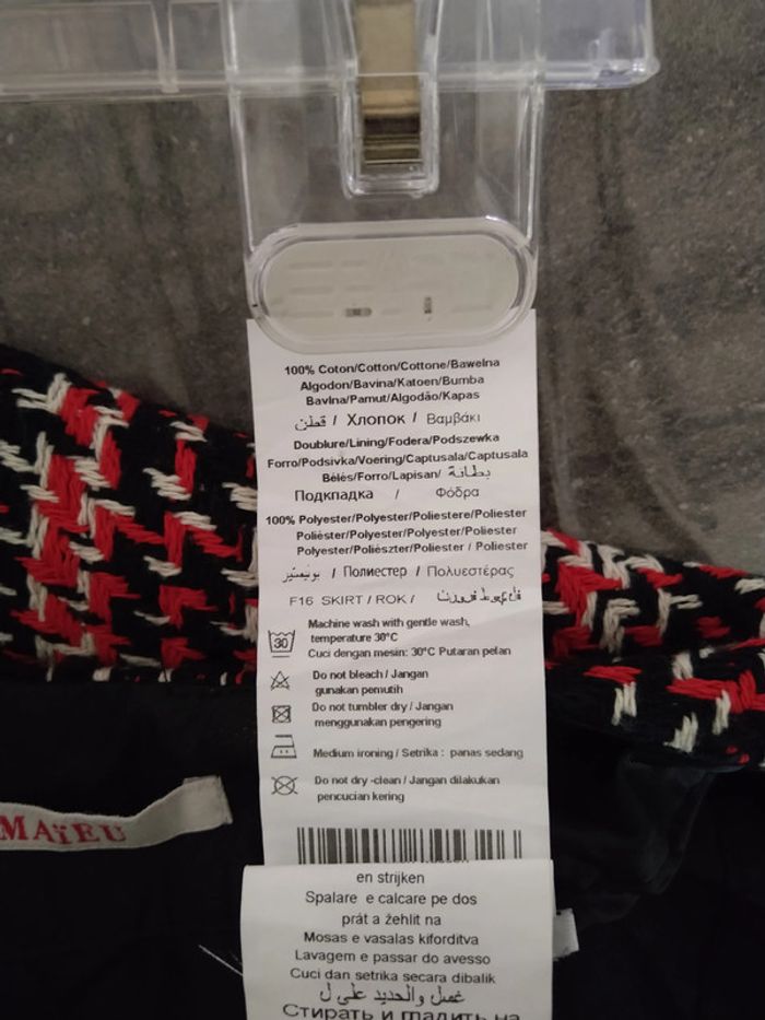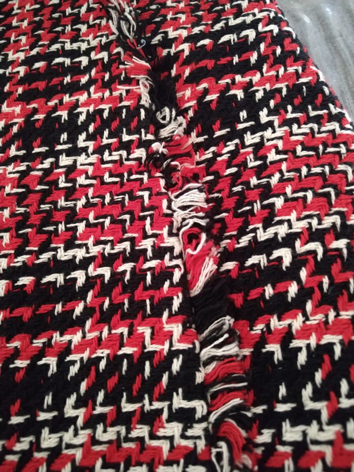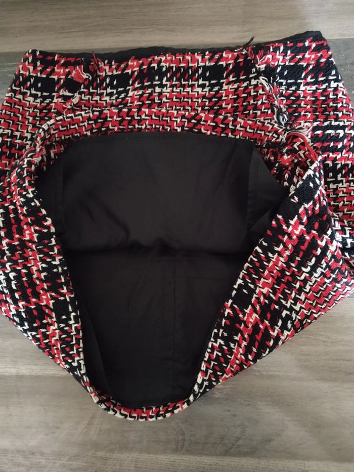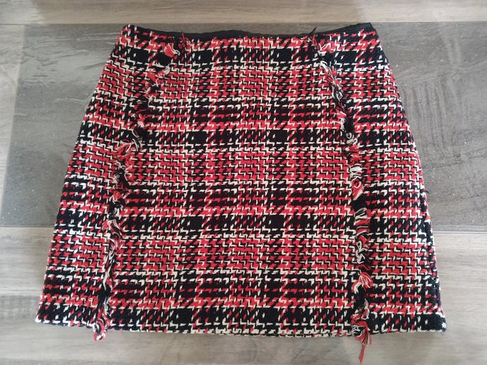 ⚠️ Description complète → Plus ⚠️ Jupe d'hiver Marque Camaïeu Taille 40 • Coloris noir, rouge, blanc • Fermeture éclair à l'arrière • Franges sur l'avant • Doublure • Non stretch Largeur taille : 38 cm Longueur totale : 42 cm En très bon état #evelyne_taille_40