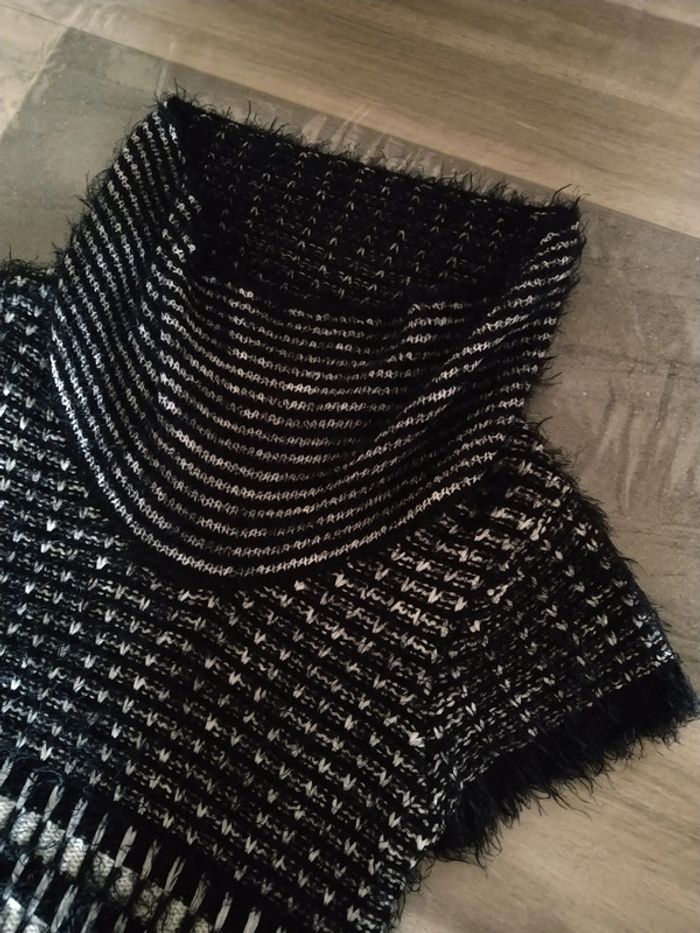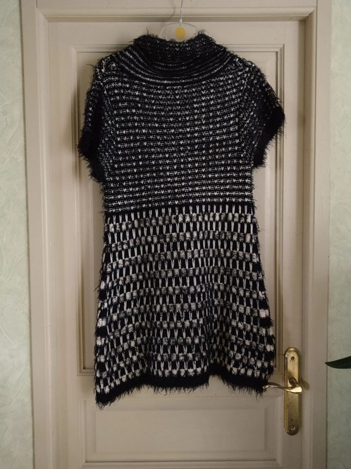 ⚠️ Description complète → Plus ⚠️ Pull long d'hiver à manches courtes Marque Patrice Bréal Taille 2, 38-40 • Coloris noir, blanc grisé • Col col roulé tombant • Mailles avec "poils" • Doux • Stretch • Plusieurs fils de tirés Largeur épaule à épaule non étirée : 42 cm Largeur épaule à épaule étirée au maximum : 52 cm Largeur aisselle à aisselle non étirée : 46 cm Largeur aisselle à aisselle étirée au maximum : 78 cm Longueur totale : 81 cm Longueur aisselle : 56 cm En très bon état #evelyne_taille_38 #evelyne_taille_40