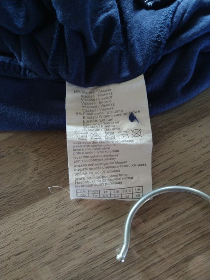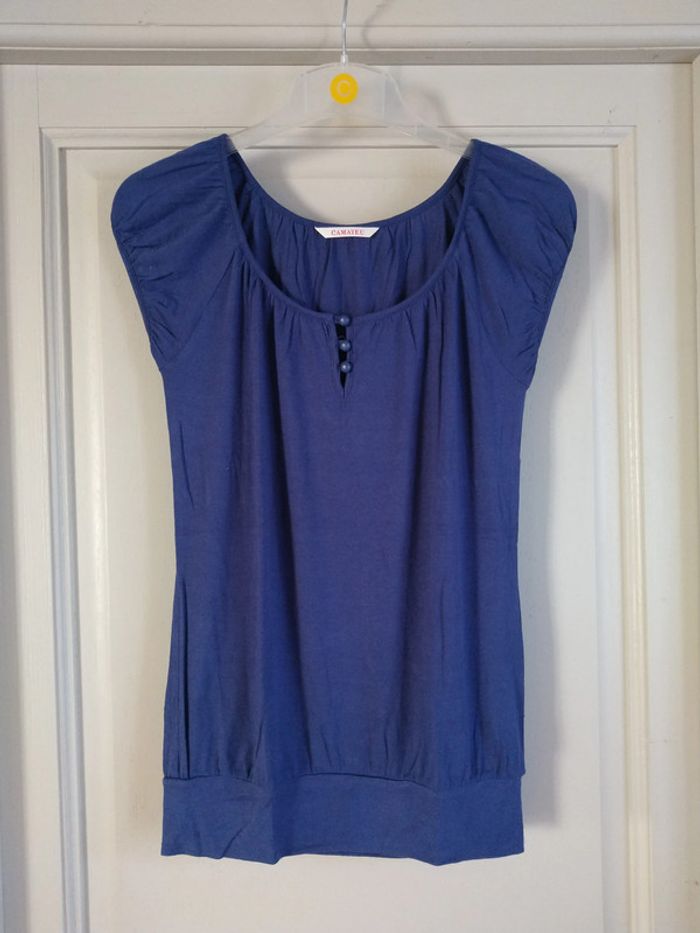 ⚠️ Description complète → Plus ⚠️ T-shirt à manches courtes Marque Camaïeu Taille XS, 34, convient également un 36 • Coloris marine • Col rond avec boutons • Bande sur le bas • Manches et col froncés • Agréable à porter • Stretch Largeur aisselle à aisselle non étirée : 46 cm Largeur aisselle à aisselle étirée au maximum : 74 cm Longueur totale : 62 cm Longueur aisselle : 47 cm Porté quelques fois, en très bon état #evelyne_taille_34 #evelyne_taille_36
