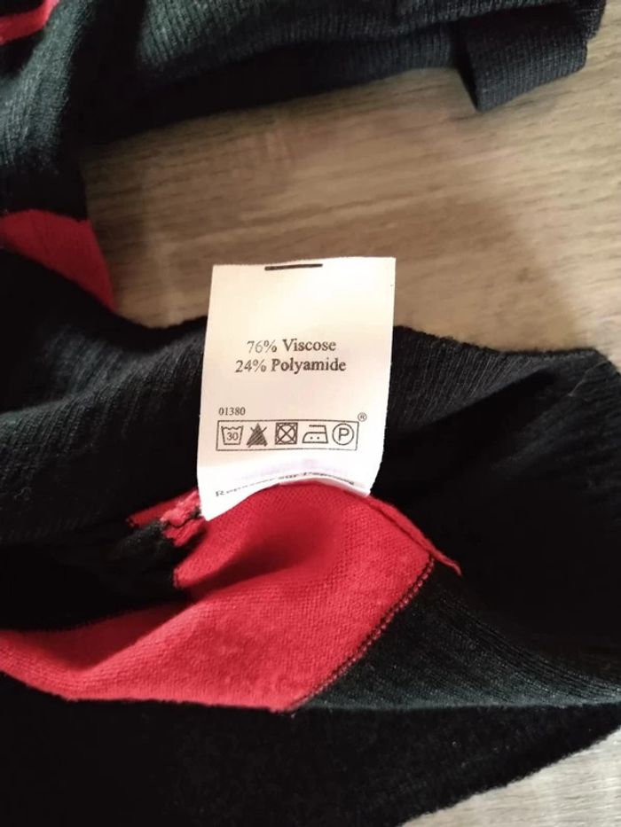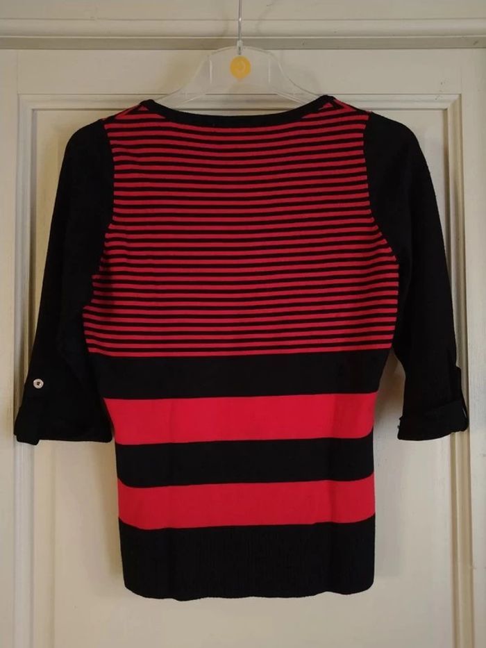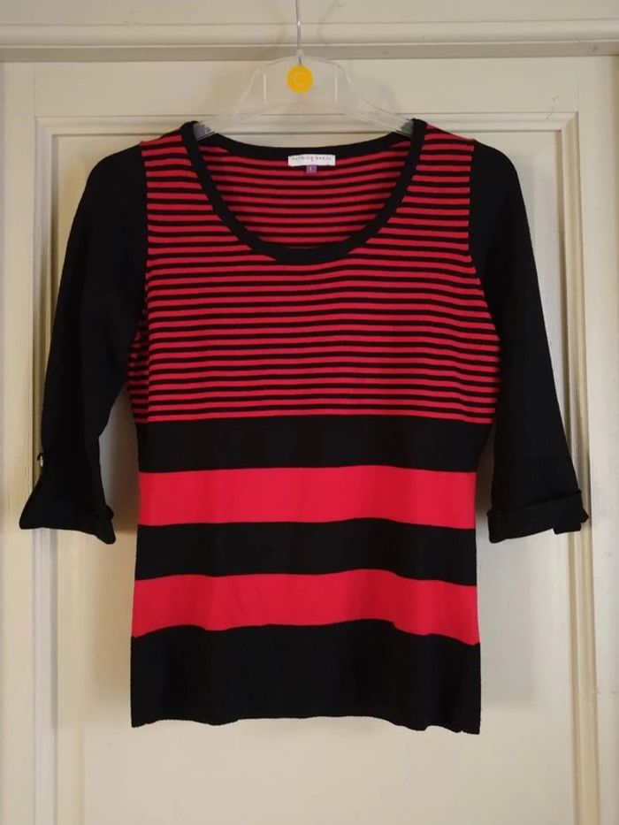⚠️ Description complète → Plus ⚠️ Pull fin à manches 3/4 et à col rond Marque Patrice Bréal Taille 1, 36-38 • Coloris noir, rouge • Motifs rayures • Manches avec languette • Agréable à porter • Très stretch Largeur épaule à épaule non étirée : 31 cm Largeur épaule à épaule étirée au maximum : 49 cm Largeur aisselle à aisselle non étirée : 44 cm Largeur aisselle à aisselle étirée au maximum : 72 cm Longueur totale : 57 cm Longueur aisselle : 37 cm Peu porté, en très bon état #evelyne_taille_36 #evelyne_taille_38