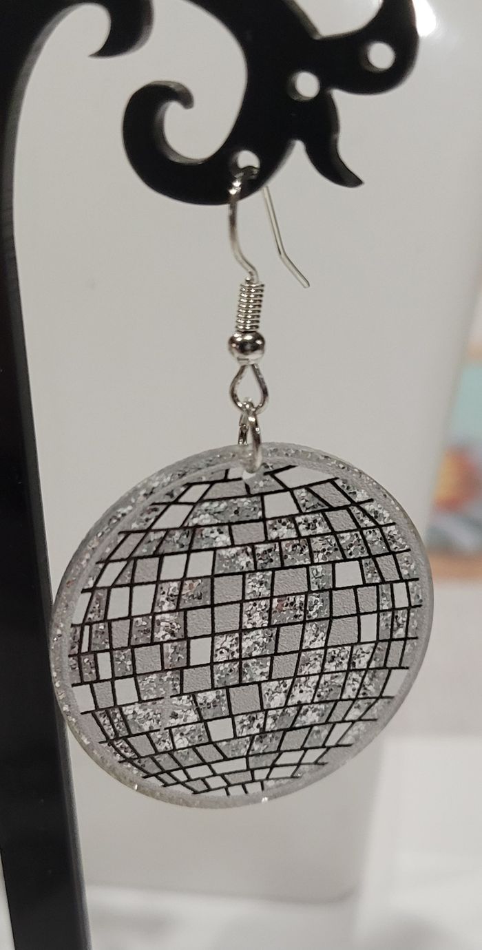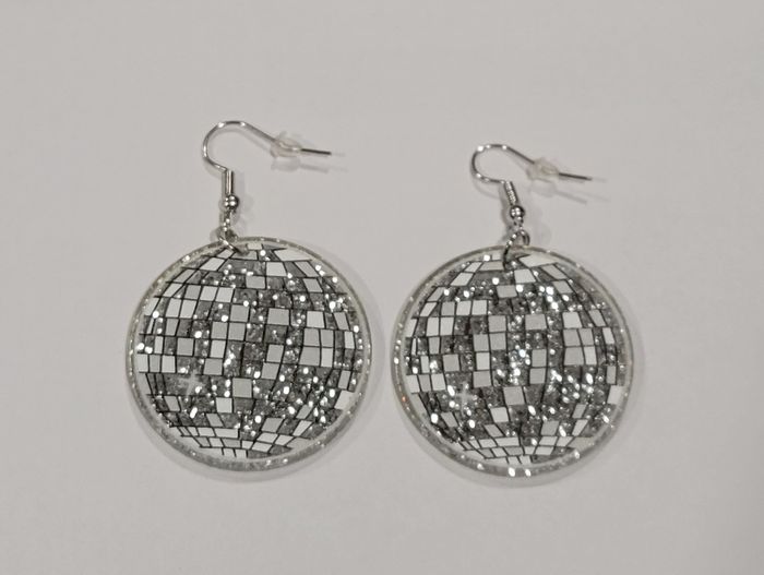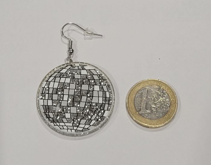 Paire de boucles d'oreilles theme disco boule a facette pailleté argenté.