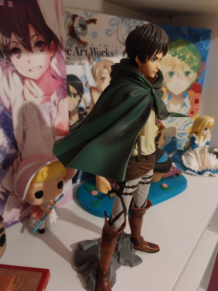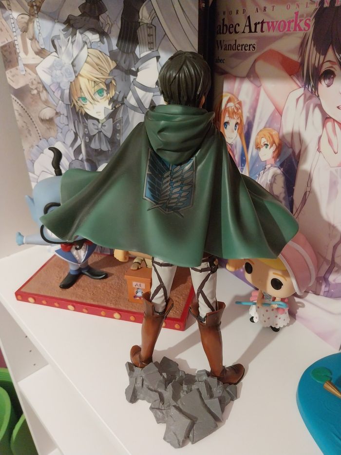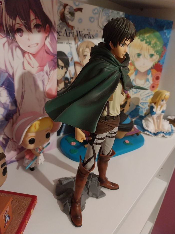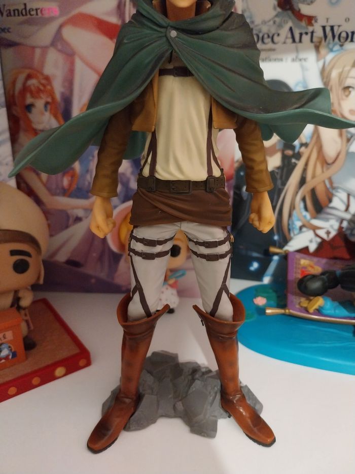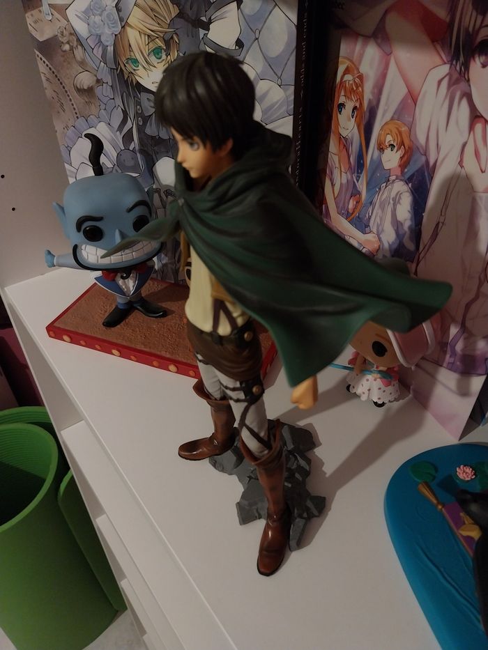 Non négociable, je vous remercie ☺️ Figurine manga animé en très bon état général et en l'état, voir les multiples photos. Je l'ai achetée comme ceci, sans boîte, et je l'ai simplement exposée. Je ne peux donc pas fournir d'informations supplémentaires sur sa provenance. C'est Eren de l'Attaque des Titans. Il est possible d'enlever son socle et sa tête afin de lui mettre ou lui retirer sa cape. Vous achetez ce que vous voyez. Shingeki No Kyojin. Je vends également les mangas. Attack on Titan. Elle mesure 26 centimètres. SNK. 27€ Envoi rapide et soigné.
