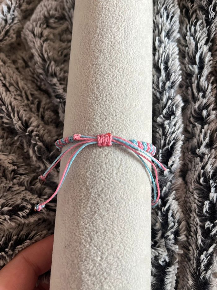 Bracelet fleurs réglable en fils de coton ciré, bleu et rose.