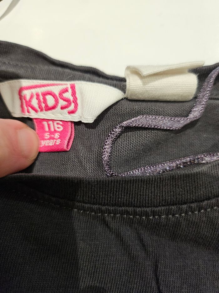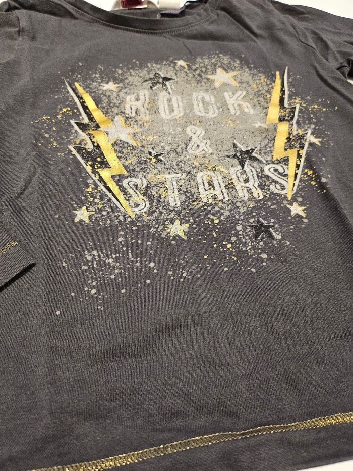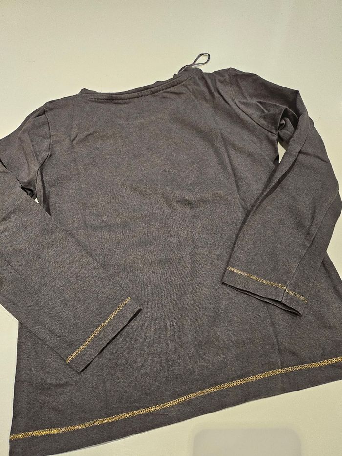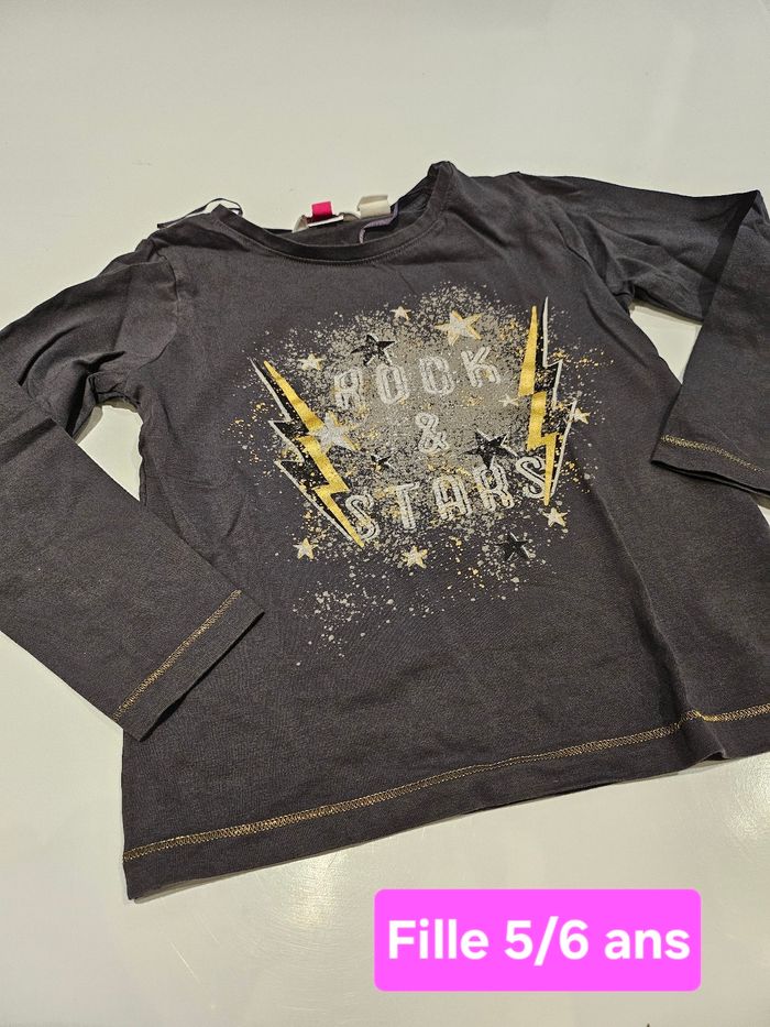 T-shirt manches longues gris avec coutures dorées. Flocage devant. Marque : Kids Taille : 5/6 ans