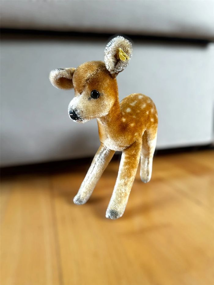 Grand faon Steiff en mohair. En mohair Avec son bouton en argent et son étiquette dans l’oreille. Idéal collectionneur