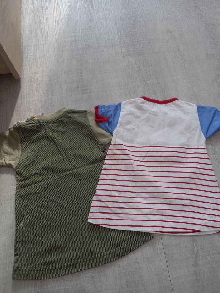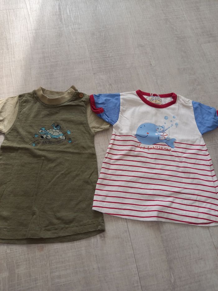 Lot de 2 robes manches courtes : 1 verte à rayures motifs tortue marque King Bear et taille 3 mois. 1 blanche à rayures rouges motifs baleine marque Kitiwatt et taille 3 mois. Tout est lavé avant envoi.