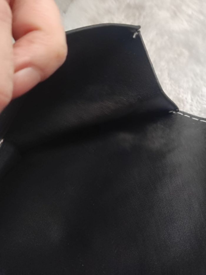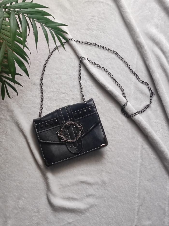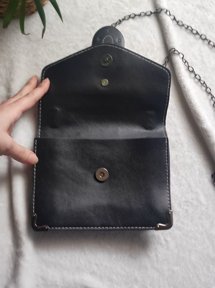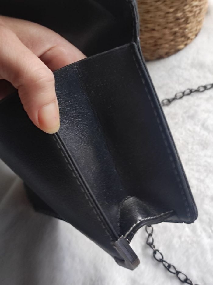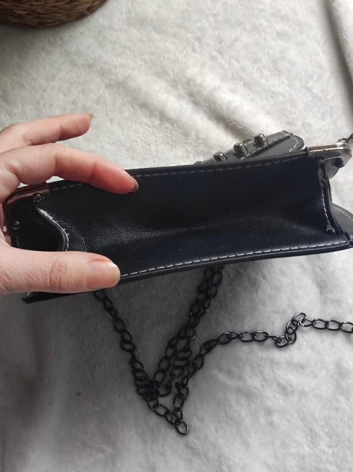 sympathique petit sac noire en cuir synthétique avec chaînette. En intérieur une petite trace de crème ( j'ai nettoyé mais sa ne pars pas ) sinon est en parfait état. Je n'ai pas de quoi mesurer Fermeture à boutons aimantés.