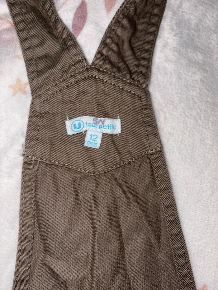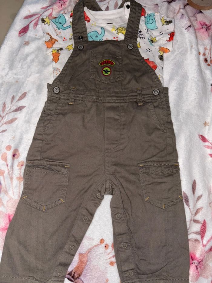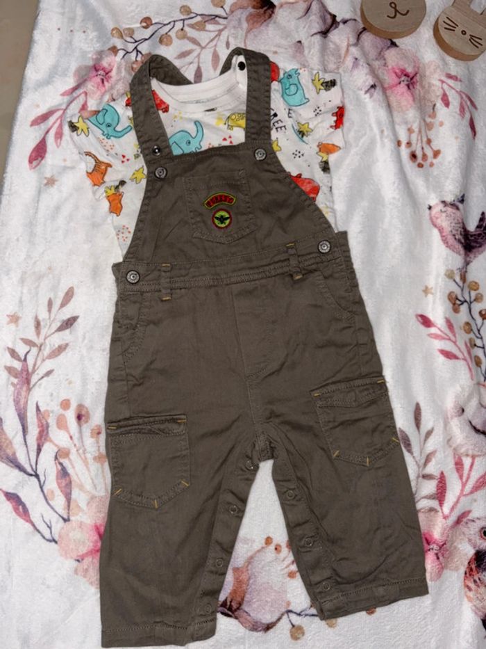 Ensemble 2 pièce bébé garçon avec une salopette kaki de la marque U taille 12 mois Et d’un tee shirt manche course de la marque orchestra taille 12 mois Initiale sur les étiquette intérieur Bon état général les manche ne sont pas déchiré c le style qui est comme sa