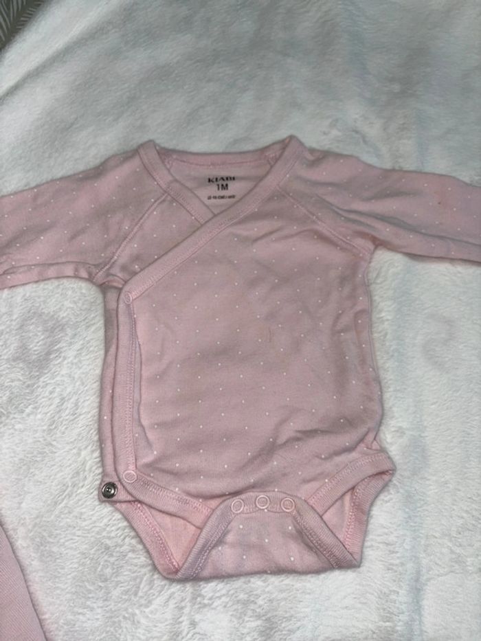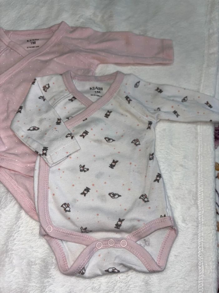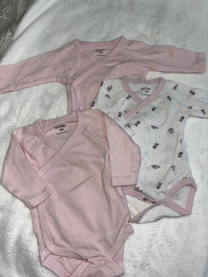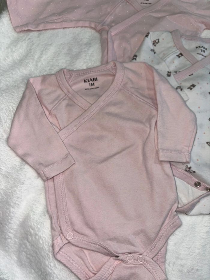 Lot de 3 body bébé fille marque Kiabi taille 1 mois 52-55 cm Très bon état , 3 léger petit point orangé sur le body rose à petit pois ce voit à peine