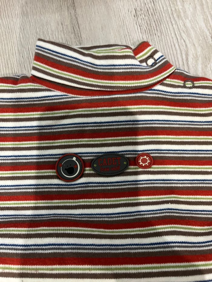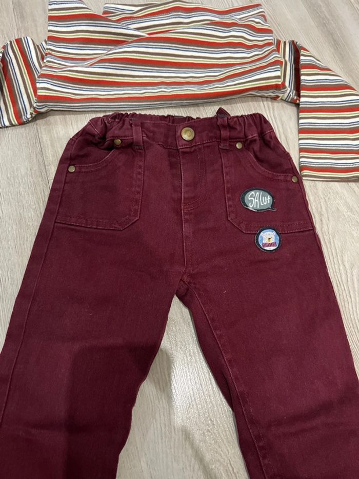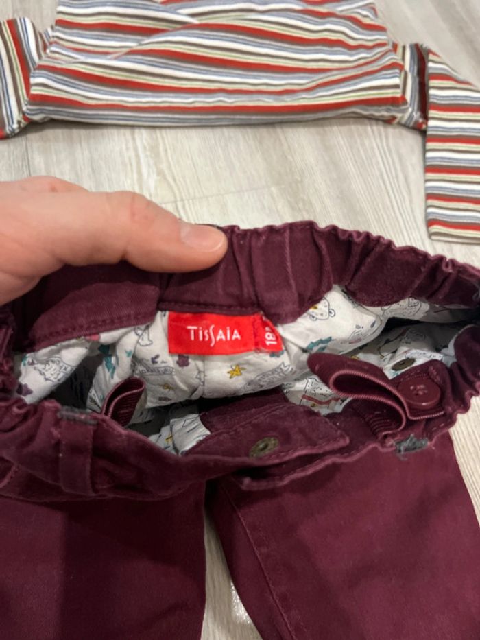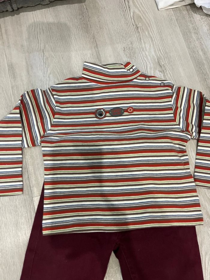 Ensemble pour garçon, composé d’un sous-pull rayé orange, gris vert de la marque Cadet RousselLe correspond à un 18 mois et un jean couleur bordeaux de la marque tissaia 18 mois. Tres Bon état.