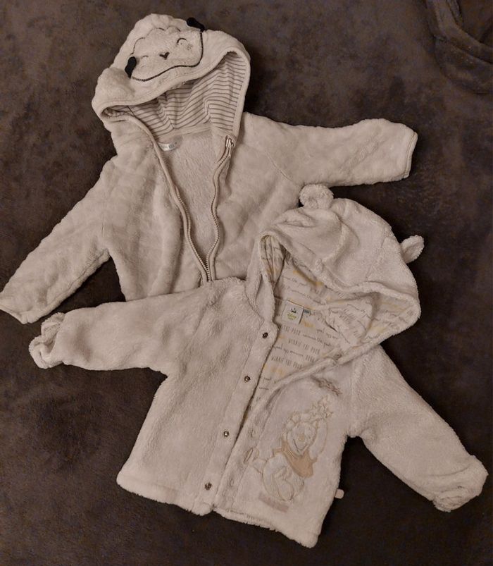 Lot de 2 manteaux avec capuches, doux et chauds pour bébé. Taille 3 mois. En bon état. Beaucoup de vêtements bébé à vendre, n'hésitez pas à me contacter. Envoi rapide et soigné.