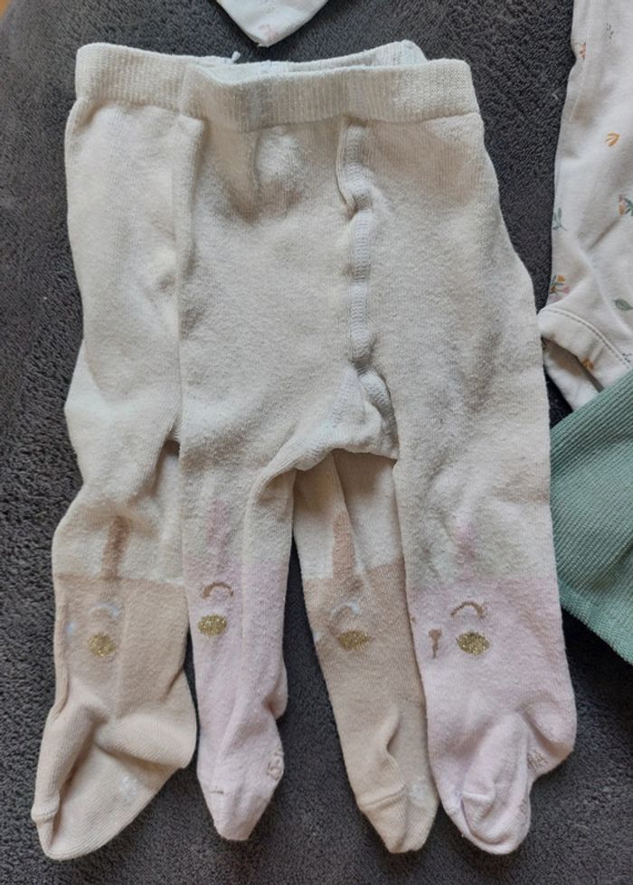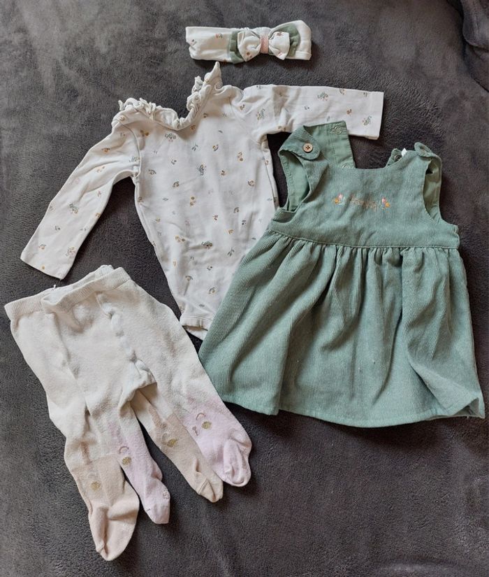 Ensemble Orchestra en parfait état. Peu porté. Taille 3 mois. Coloris vert/écru/rose. Body + robe + bandeau + 2 paires de collants lapin. Beaucoup de vêtements bébé à vendre, n'hésitez pas à me contacter. Envoi rapide et soigné.