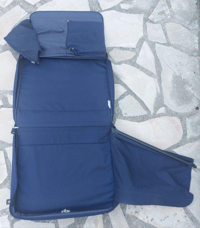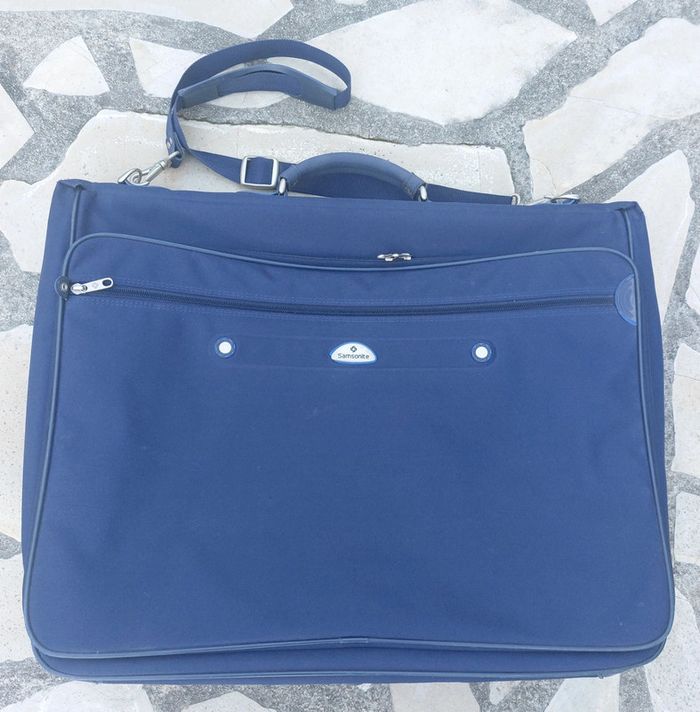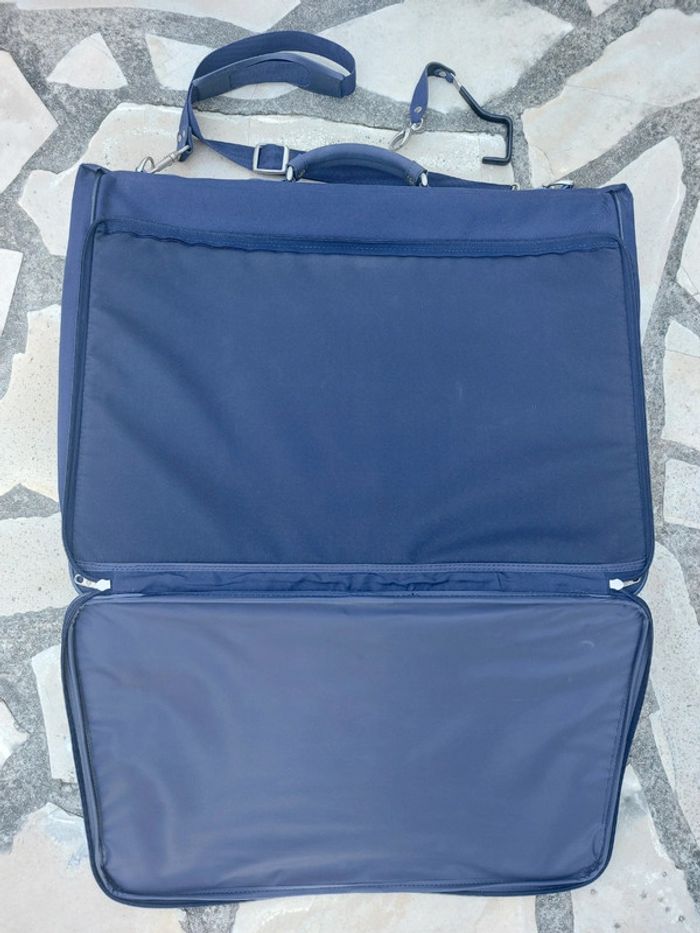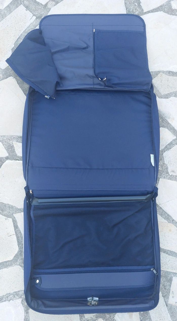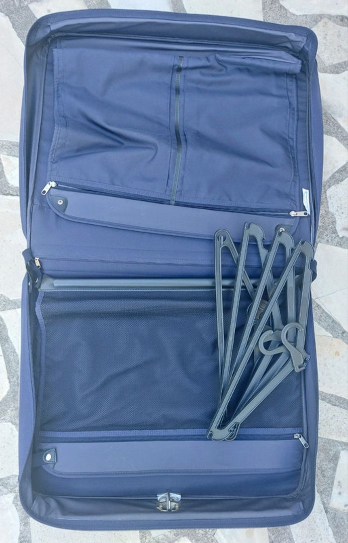 Grande valise souple de la marque Samsonite. Coloris bleu marine. Grande qualité. En parfait état. Dimension 60x50x15 cm. Idéale pour les costumes et tailleurs. Nombreuses poches. Parois amovibles pour garder les vêtements à plat sans les froisser. Avec ceintres et crochet de suspension. Sangle de transport. A retirer sur place ou dans les environs. Pas d'envoi.