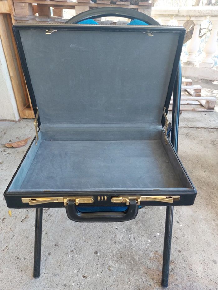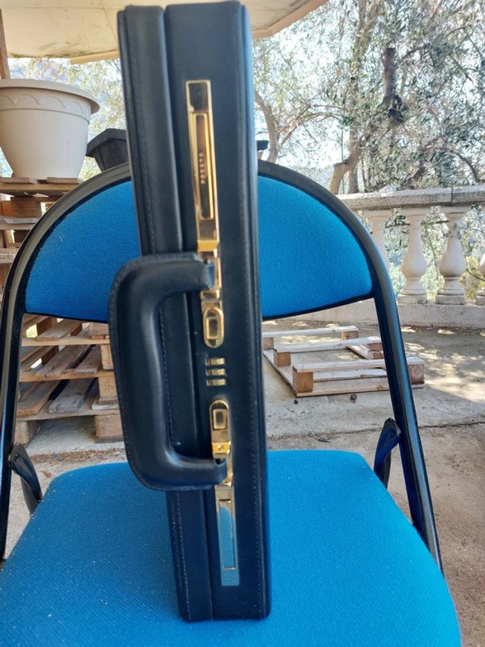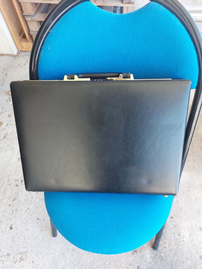 Mallette rigide type attaché case en cuir noir. Marque Presto. Fermeture par code à 3 chiffres. Boucherie en laiton doré. Intérieur tissu gris clair. En très bon état. Envoi rapide et soigné.
