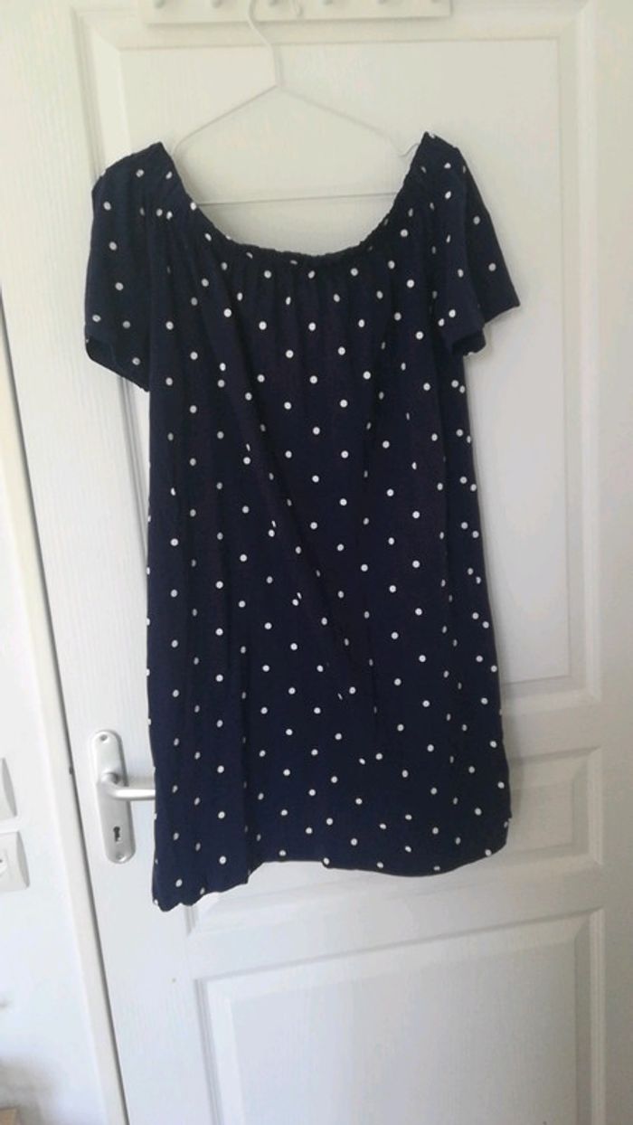 Robe bleu marine à pois blanc Épaules dénudées Arrive juste au dessus du genou