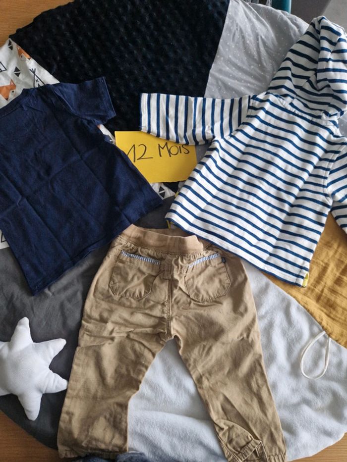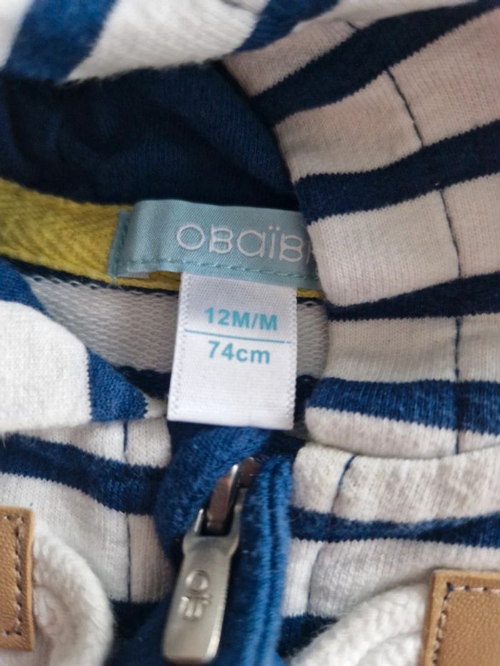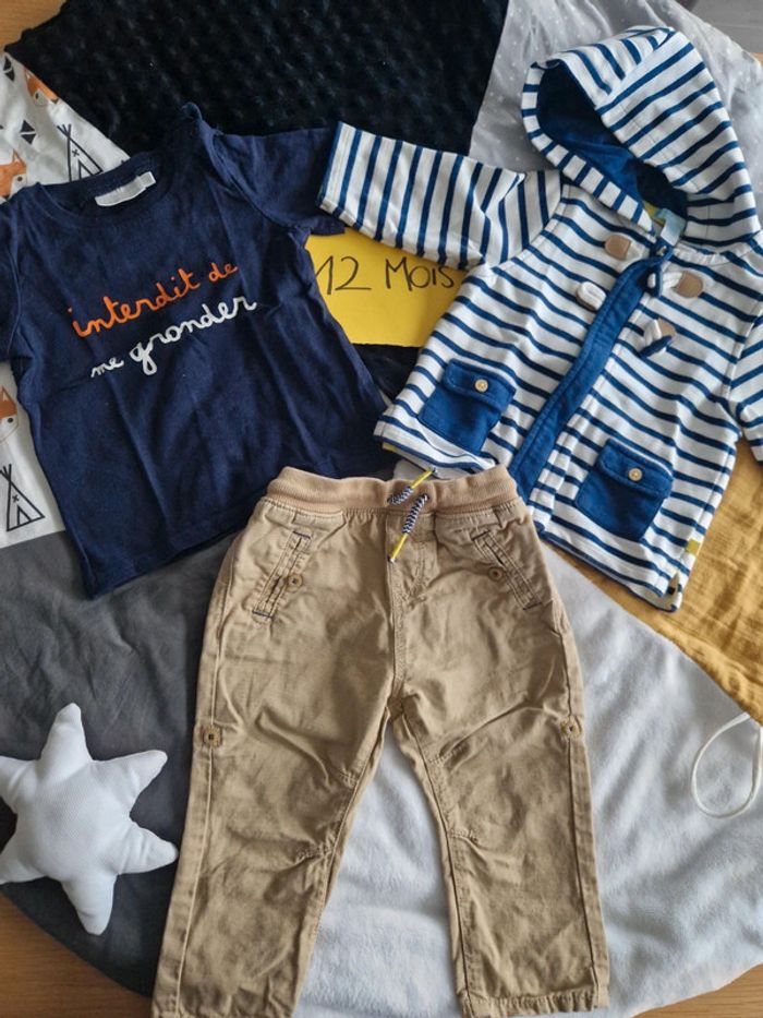 Ensemble composé de : - pantalon beige Obaïbi - sweat capuche zippé rayé blanc et bleu Obaïbi - t-shirt "interdit de me gronder" bleu 12 mois. Très bon état. ➡️ N'hésitez pas à me faire des propositions de lots / tout doit partir / besoin de place pour petite sœur qui arrive bientôt 😊 Tout le 12 mois de mon dressing en cliquant ici : #ju276_garçon12mois