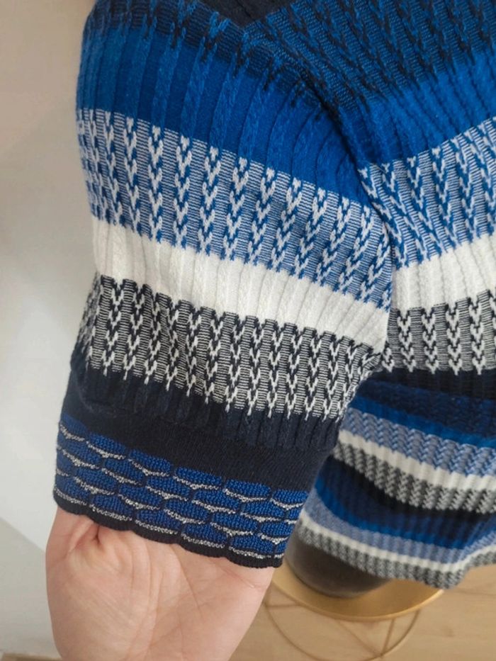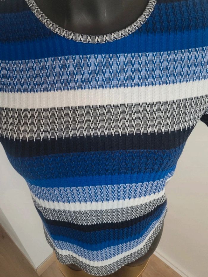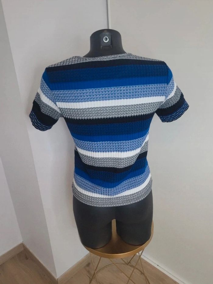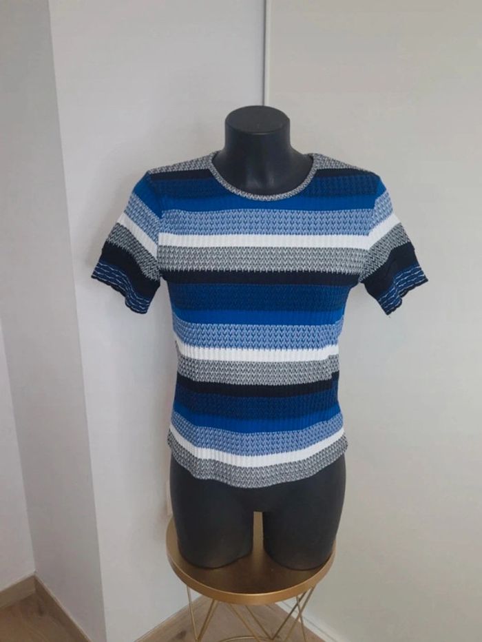 Top promod Motifs bleu, blanc Étiquette coupée mais correspond à une taille 38 Moulant, près du corps Élastique Peu porté N'hésitez pas à créer votre lot, n'hésitez pas à cliquer sur les liens pour voir mes autres annonces : #beautifuldressingv38 Remise sur les lots activées !