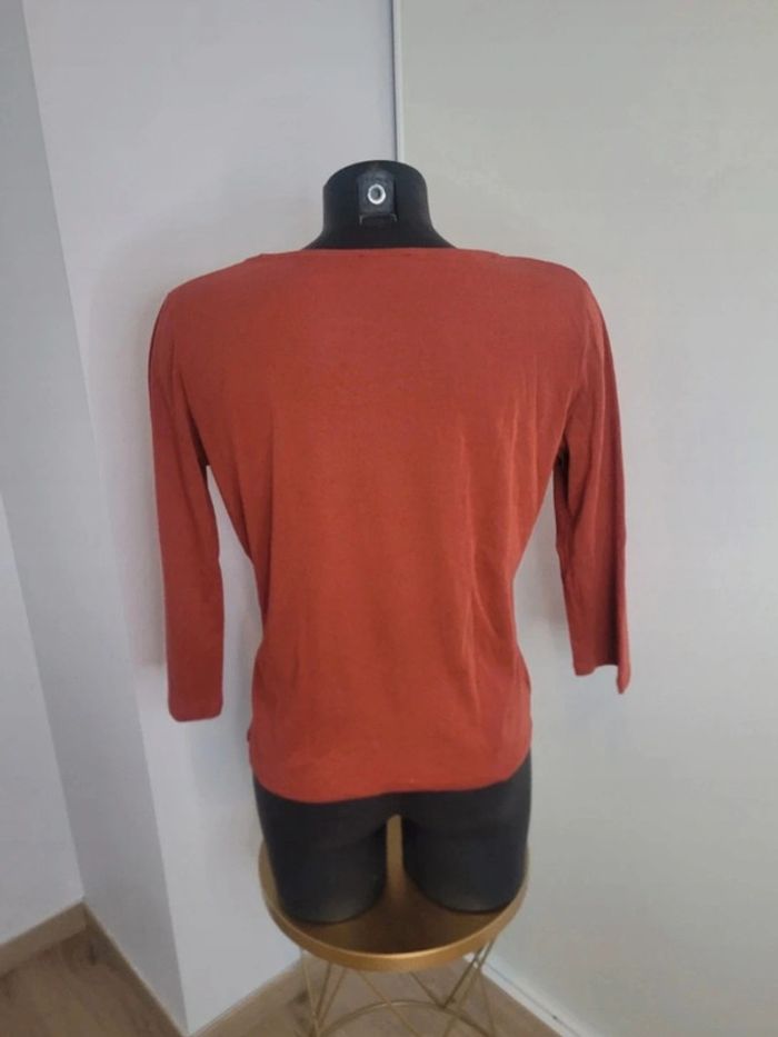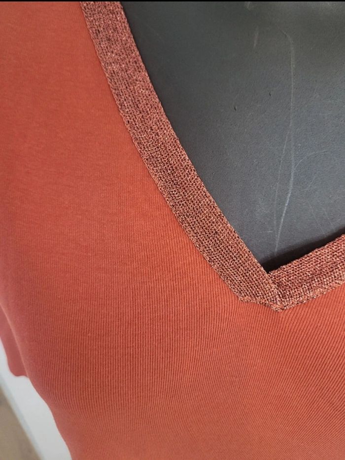 Top tee-shirt couleur rouille 123 Taille M (38) Manches 3/4 50% coton, 50% modal + fibre métallisée Peu porté N'hésitez pas à créer votre lot, n'hésitez pas à cliquer sur les liens pour voir mes autres annonces : #beautifuldressingv38 Remise sur les lots activées !