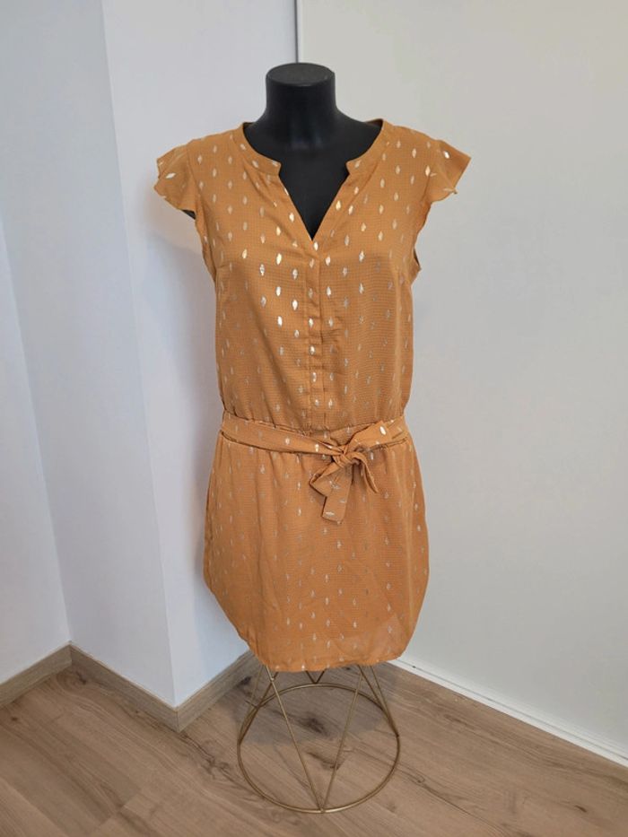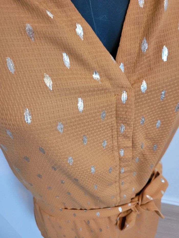Robe jaune moutarde Cache cache Élastique au niveau de la taille Taille 36 100% polyester Doublure 100% polyester N'hésitez pas à créer votre lot, n'hésitez pas à cliquer sur les liens pour voir mes autres annonces : #beautifuldressingv36 Remise sur les lots activées !