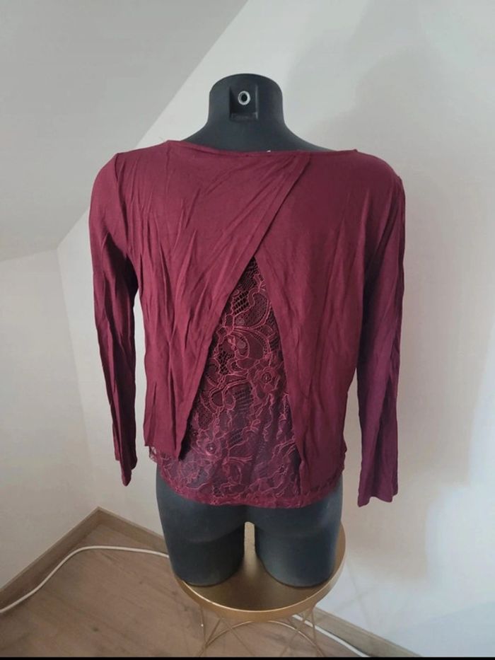 Tee shirt manches longues Bordeaux Pimkie Taille 38 Dentelle transparente à l'arrière N'hésitez pas à créer votre lot, n'hésitez pas à cliquer sur les liens pour voir mes autres annonces : #beautifuldressingv38 Remise sur les lots activées !