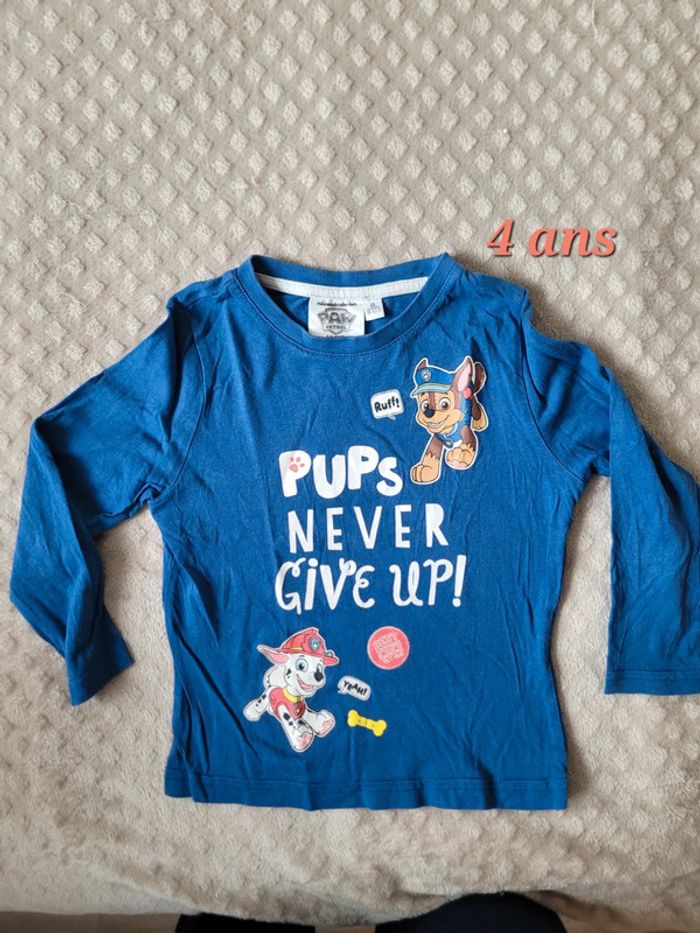 Tee-shirt manches longues bleu Pat patrouille Nickelodeon 4 ans Chase et Marcus Petit trou à l'arrière (voir dernière photo) N'hésitez pas à créer votre lot, n'hésitez pas à cliquer sur les liens pour voir mes autres annonces : #beautifuldressingv4ans #beautifuldressingvenfant Remise sur les lots activées !