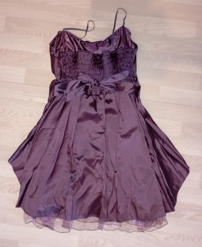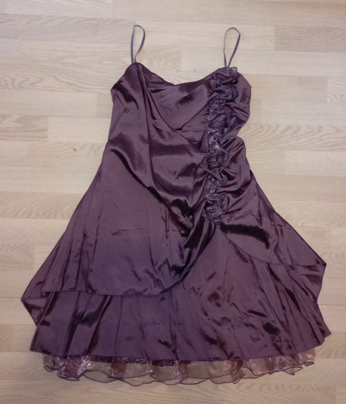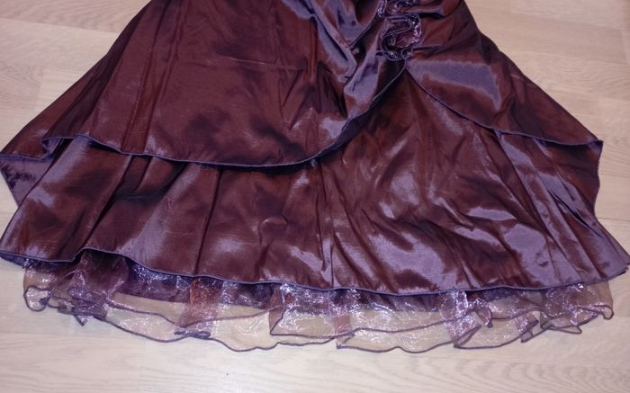 Robe de soirée ou de cérémonie satinée couleur violine avec des jolies fleurs sur le devant côté gauche et des pans asymétriques T. XXXL (correspond à un 50-52 je dirais) Très bon état général, juste la doublure intérieure du dos qui a été recousue par mes soins N'a été portée que quelques heures