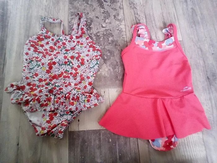 Vends 2 maillots de bain bébé fille de 18mois en excellent état jamais mis un de la marque bout'chou et u' décathlon qui s'ouvre pour pouvoir changer la couche si besoin. Allez voir mon dressing je fais un grand tri !