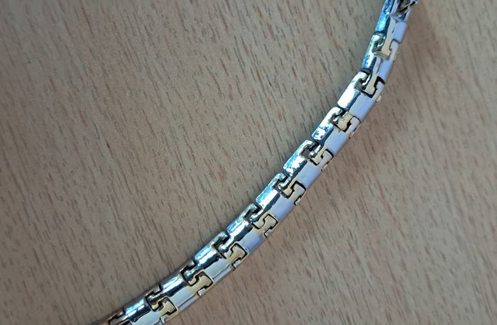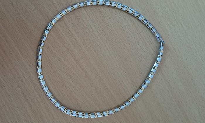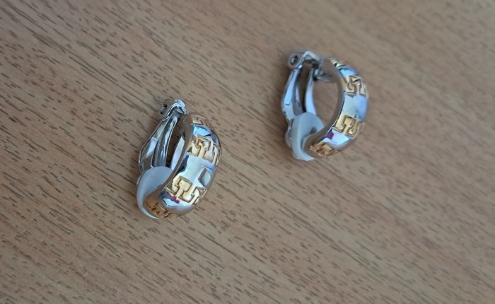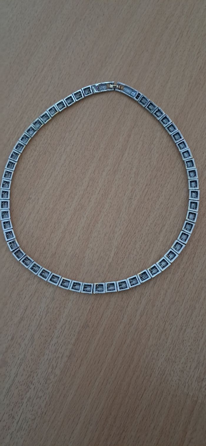 Collier ras le cou semi rigide de 44 cm (pas la taille correspondante dans la rubrique) Boucles d'oreilles clip Acier 2 tons, doré et argenté Excellent état Je ne me souviens pas où je l'avais acheté ☹️