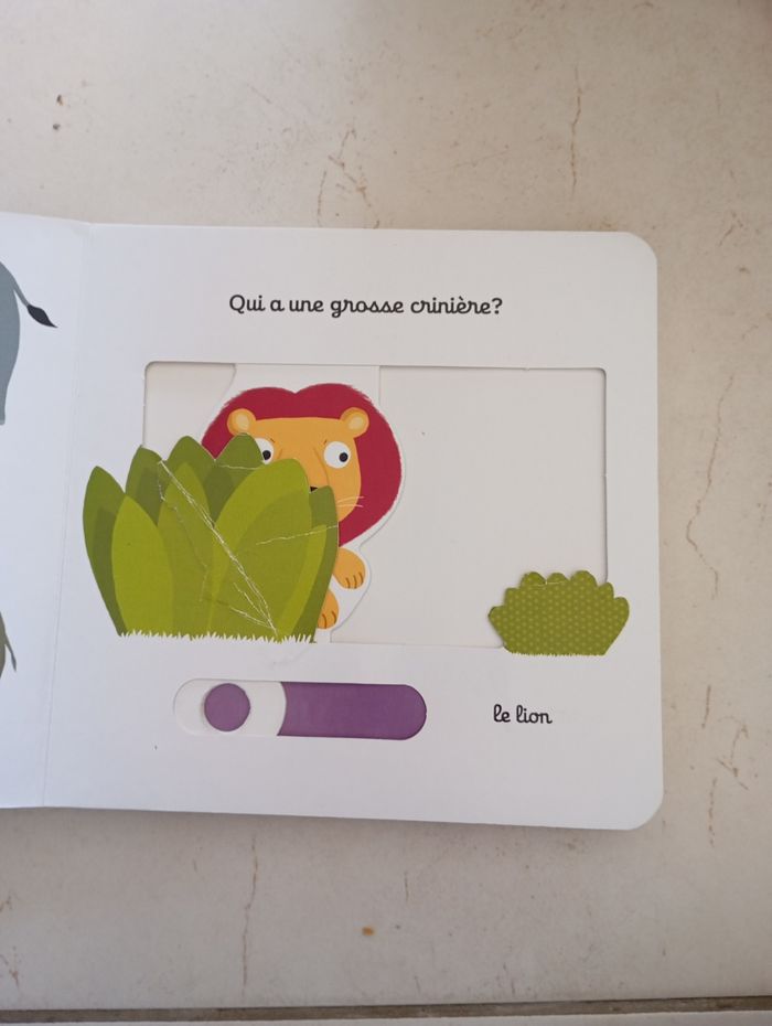 Mon imagier des animaux sauvages chez nathan kididoc de 1 à 3 ans Très bon état car en carton très épais mais des petits défauts voir photos Ce titre s'insère dans une série de premiers imagiers interactifs que l'on a judicieusement réalisés sur de très épaisses pages cartonnées conçues pour résister aux petites mains. Ce sont quelques animaux sauvages qui sont présentés ici, depuis le zèbre jusqu'au renard en passant par le singe, l'ours, la pieuvre, la baleine ou le poisson-clown. Sur chaque double page, trois ou quatre espèces nommées de manière traditionnelle sont déclinées en regard d'une saynète introduite par une question et animée d'une tirette ou d'une roulette (de manipulation un peu difficile). Les images sont finalement réunies sur la dernière double page afin de permettre à l'enfant de tester sa mémoire