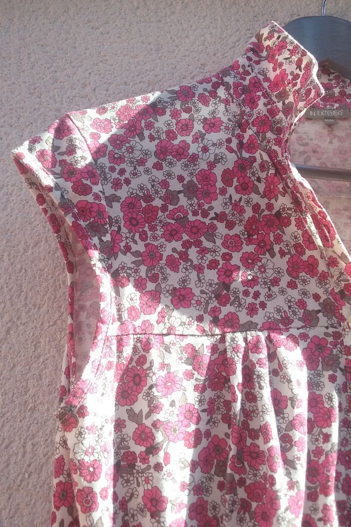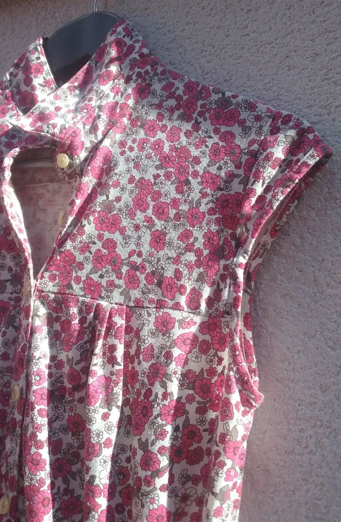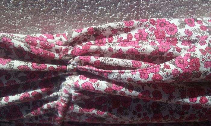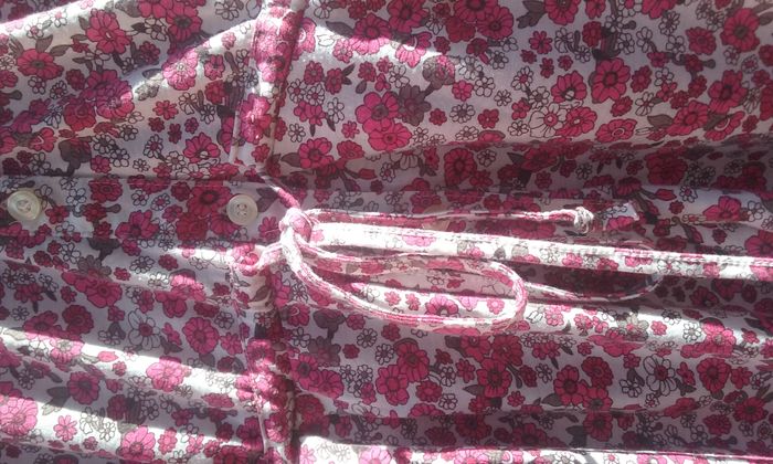 2 poches, fermeture boutonnée, élastiqué à la taille avec cordon de serrage, coloris rose-blanc-gris.