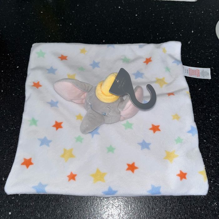 Doudou, plat carré, étoile, orange bleu jaune sur velours blanc, tête, peluche, éléphant Dumbo, chapeau jaune article neuf encore avec étiquette